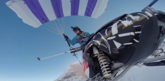Финландецът Анти Пендикайнен полетя със сноумобил, като първоначално кара моторна шейна в планината, след което се спусна с парашут