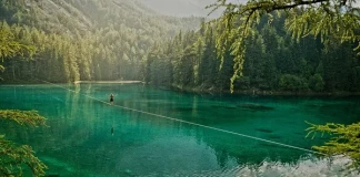25-годишният Mich Kemeter премина по слаклайн дълъг 250 метра, опънат над изключително красиво планинско езеро в Австрия