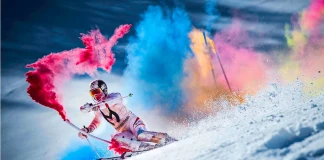 Марсел Хиршер се спусна между колчета, пълни с бои на прах, и остави истинска цветна феерия по снега след себе си