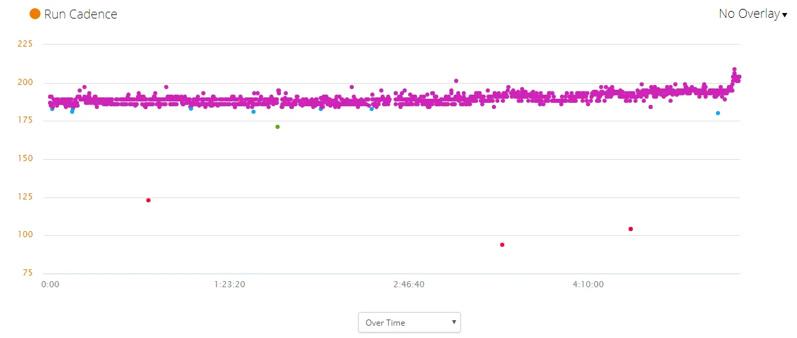 Друга любопитна информация, която получаваме от fenix 5X е кадансът на бягането. Интересното тук е, че Garmin Connect автоматично съпоставя каданса на конкретния бегач, в случая Краси Георгиев, с беговите каданси на останалите бегачи, като ги разделя на пет отделни групи, всяка от които визуализирана в различен цвят. Лилавият каданс, който виждаме при Краси, е за групата бегачи, тичащи в тенденция над 183 стъпки в минута. Garmin Connect ни казва още, че като цяло по-опитните бегачи се движат в каданс над 180 стъпки в минута, а по-бързият каданс се асоциира с по-малко време, “прекарано” в контакт със земята. Любопитната подробност, която разбираме е, че при по-високите бегачи се наблюдава тенденцията по-бавен каданс. 209 стъпки в минута е най-високият каданс, отчетен при Краси по време на това бягане, а най-бавният – 94 стъпки в минута.