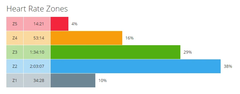 Зони на сърдечната честота, измерващи в проценти времето, прекарано във всяка от тях. Започват от Z1 – загрявка (пулс: 108-132 удара в минута), до Z5 – максимално натоварване (повече от 166 удара в минута)