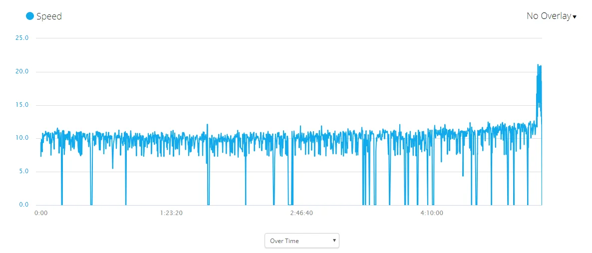При скоростта също забелязваме интересен резултат. В продължение на почти цялото бягане Краси се е движил с около 10 км/ч и е стартирал с около 9.4 км/ч. Интересното е, че най-голямата развита скорост се е случила към финала на бягането (когато предполагахме, че атлетът ще бъде по-скоро уморен, отколкото в кондиция за финален спринт). Всъщност, след 45-ия километър започва едно почти постоянно увеличаване на скоростта на бягането, достигаща до 21.1 км/ч на 49-ия километър. Тогава пулсът на Краси се е вдигнал и до 165 удара в минута.