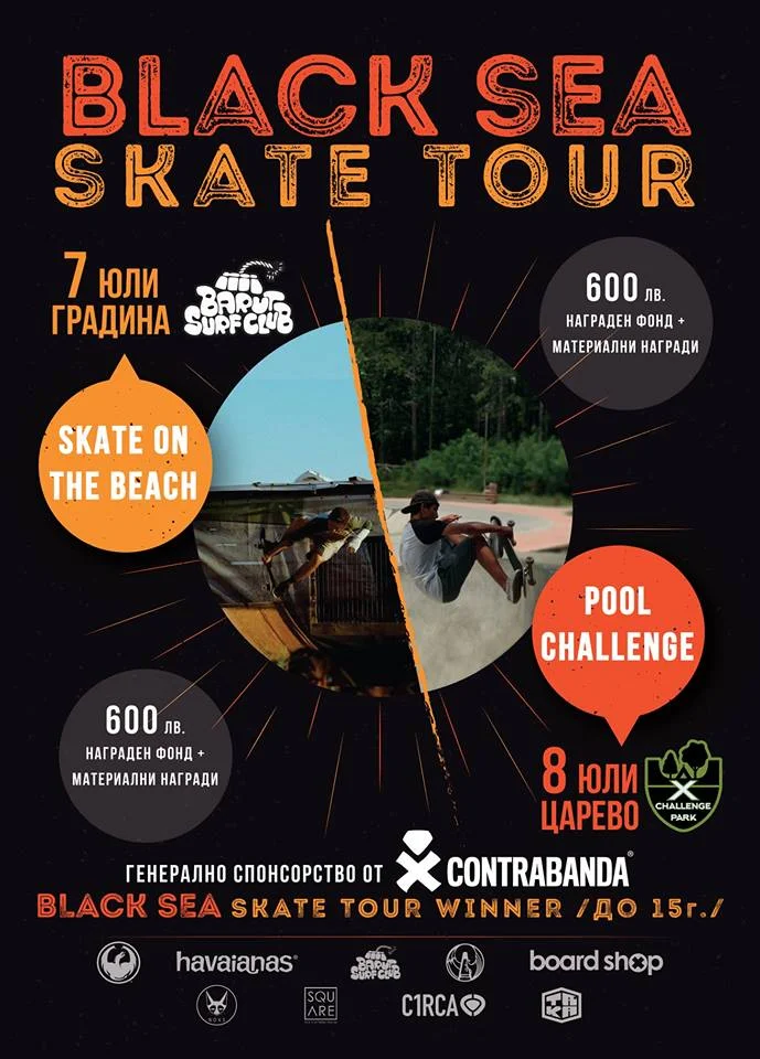 Състезанията по скейт ще имат две спирки: къмпинг “Градина” – Барут сърф клуб (07.07) и Царево – Xchallenge Park (08.07). В Барут сърф клуб скейтърите ще се състезават на мини рампа, а в Xchallenge Park – в скейт пуула на парка.