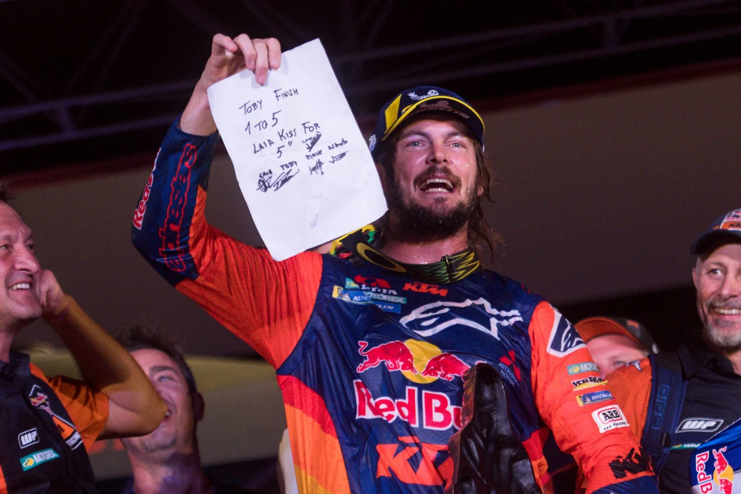 Тоби Прайс спечели блестящо последния етап и така си осигури титлата при мотоциклетистите за втори път от 2016-а насам. Той се пребори с остра болка в дясната си китка, причинена от скорошна операция на счупена скафоидна кост. След него се наредиха съотборниците му от тима на „пустинните криле“ Матиас Уокнър и Сам Съндърланд. В добавка към титлата, той спечели и целувка от дамата в отбора Лая Санц, с която са сключили облог.