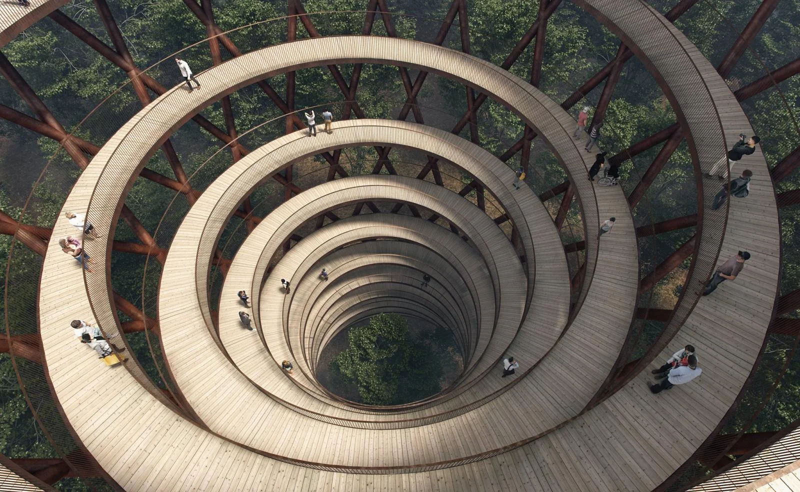Само на 50 минути път с кола от Копенхаген, в средата на горите на Югоизточна Дания се издига 45-метрова структура от дърво и стомана. Има формата на серпентина, разширяваща се нагоре и представлява…горска пътека.