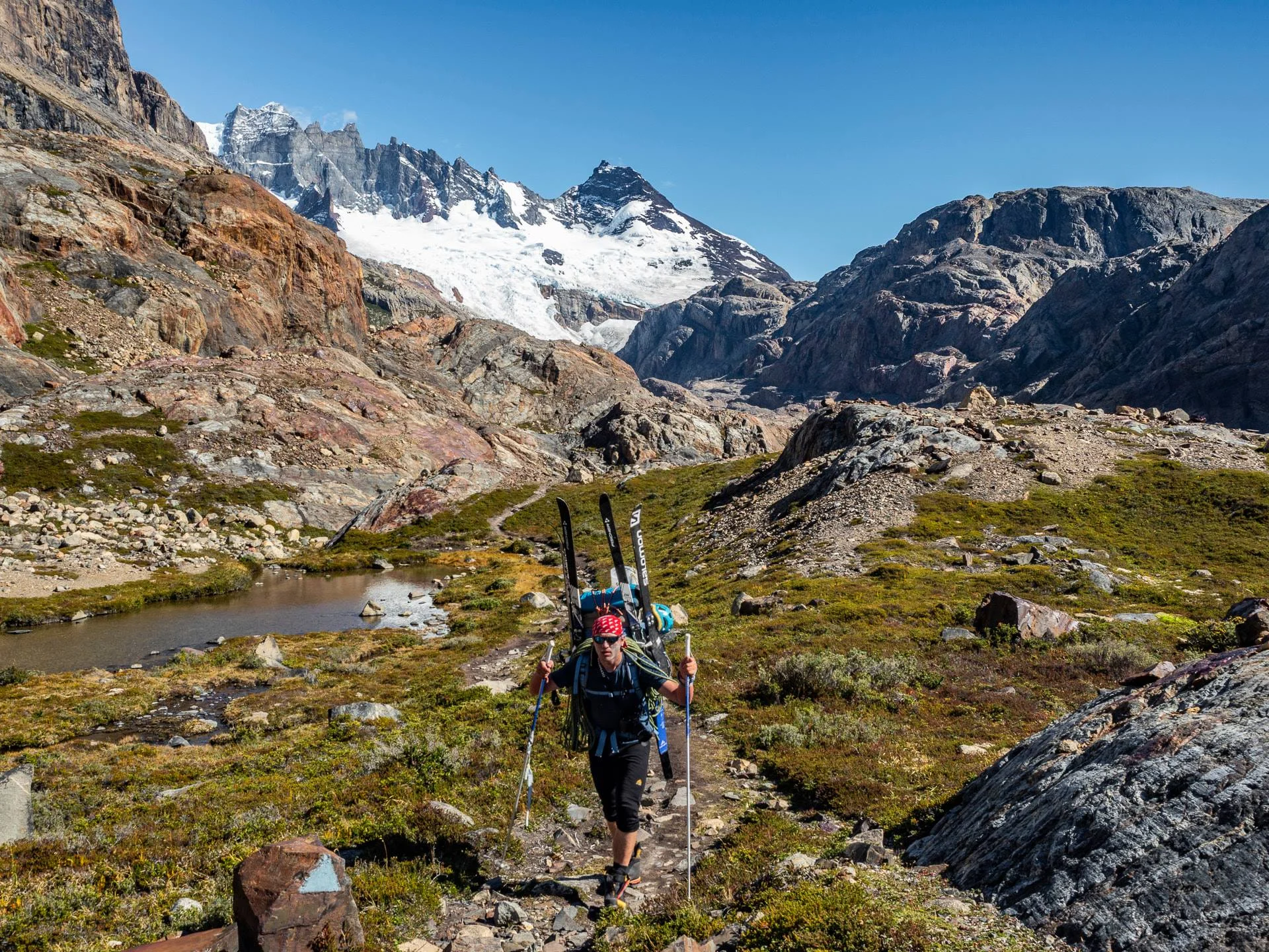 Неусетно (да бе да, друг път…) изминават 4-5 часа. Крачите през обширна и много стара ледникова долина. Изкачвайки поредния скален праг, до теб се разкрива гледката на езерo с води в електрически цвят, а от другата ти страна виждаш западните и северни стени на масива Fitzroy, върху които танцуват сенките на облаци, бързащи през синевата. Искаш да изпиеш с очи тази безумна красота на много големи глътки, но една мъничка дреболийка ти танцува върху нервичките. Опънал си жилите на врата яката, понеже гърба те боли хамалската. Пфу…тежка е тая проклетия бе! Някъде между 2364-тия и 37484-тия реглаж на презрамки и стягане/отпускане на колан, се плесваш по челото. Тъпанар! Забравил си дължината на гърба по-къса от оня път през зимата. Ха! Намерихме му цаката и се чувстваме като върха на гъза на слона, мухаха.
