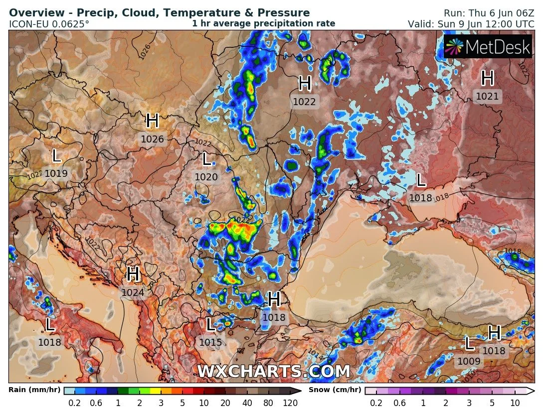 В неделя времето ще се влошава и в планините ще има значителни краткотрайни валежи, още от сутринта в Централна България. Температурите ще се понижават с 3-5 °С и вятърът ще отслабва и ще се преориентира от североизток. По Черноморието вятърът ще бъде по-силен след обяд, като ще достига 5-7 м/с при земята. Вълнението ще е слабо – до 20-30 см и температурата на водата ще е около 21-22 °С. Валежи по Южното Черноморие не се очакват.