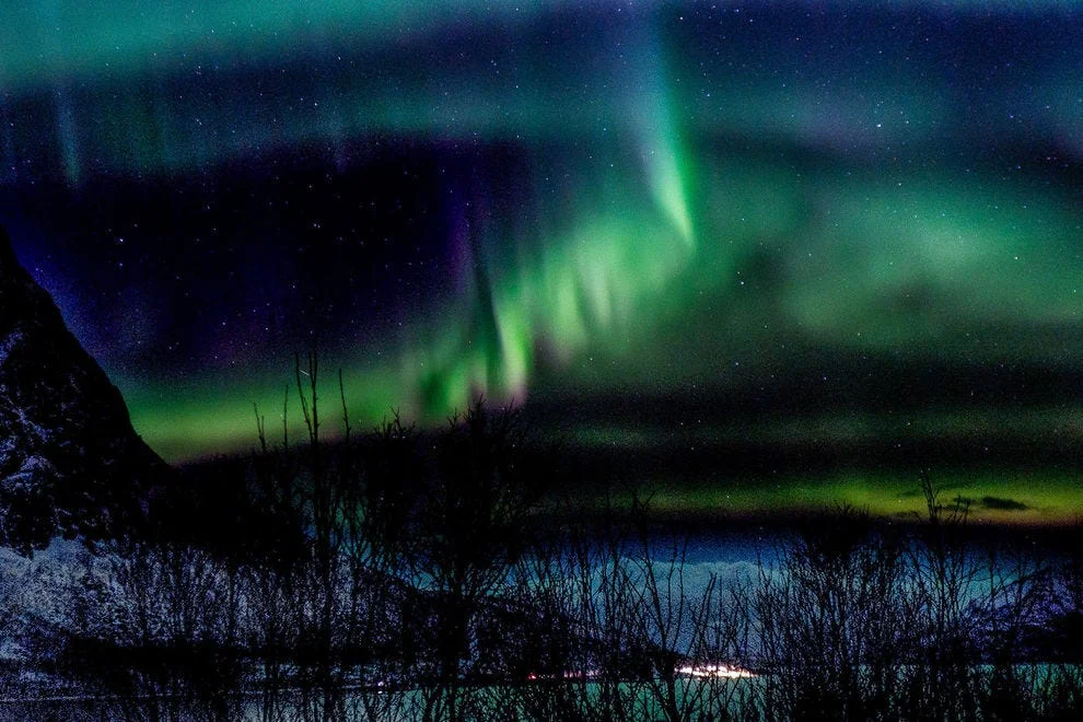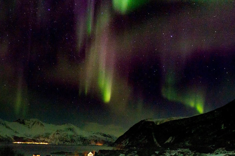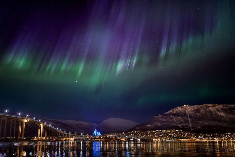 Останете в Тро̀мсьо и наблядавате Северното сияни, примесено с блечукащите светлинки на града.
