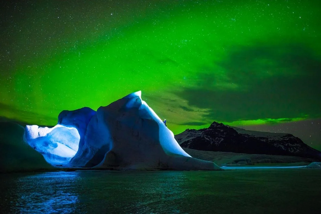 Когато слънцето се скри, забелязахме че Северното сияние е видимо, включихме трите челника, за да осветим силуета на ледения къс, а Рахел тръгна нагоре, докато аз снимах от съседния бряг.
