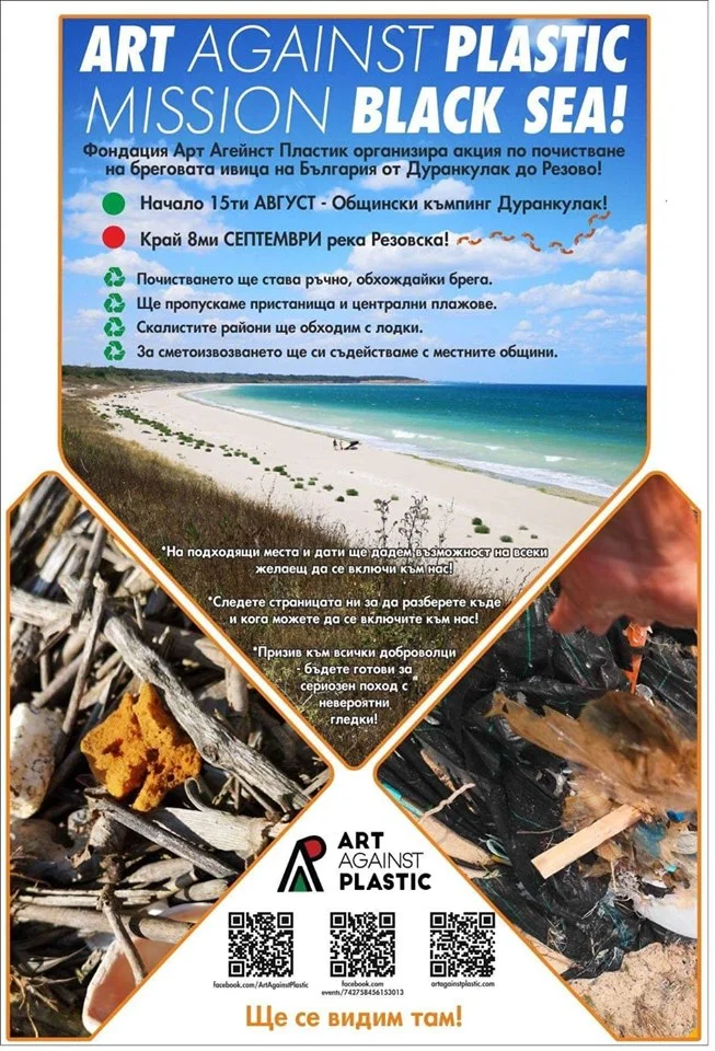 15 август е денят, в който оргазнизацията Art Against Plactic ще стартира първата си инициатива по почистване на Черно море. Изходната точка е Общински къмпинг Дуранкулак, а кампанията ще продължи 25 дни – до 8 септември и ще завърши край река Резовска.