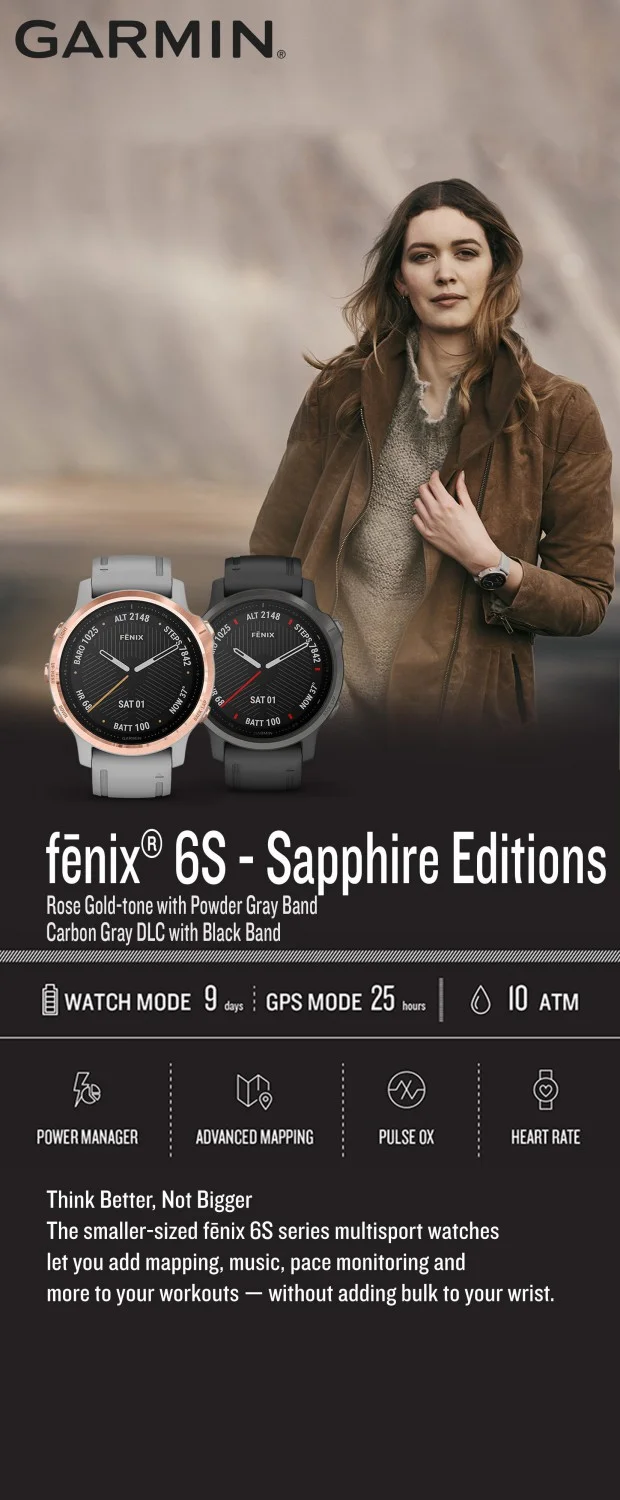Несъмнено, един от най-красивите модели, който веднага ще привлече вниманието на приключенски настроените дами, е Garmin Fenix 6S Sapphire Rose Gold.