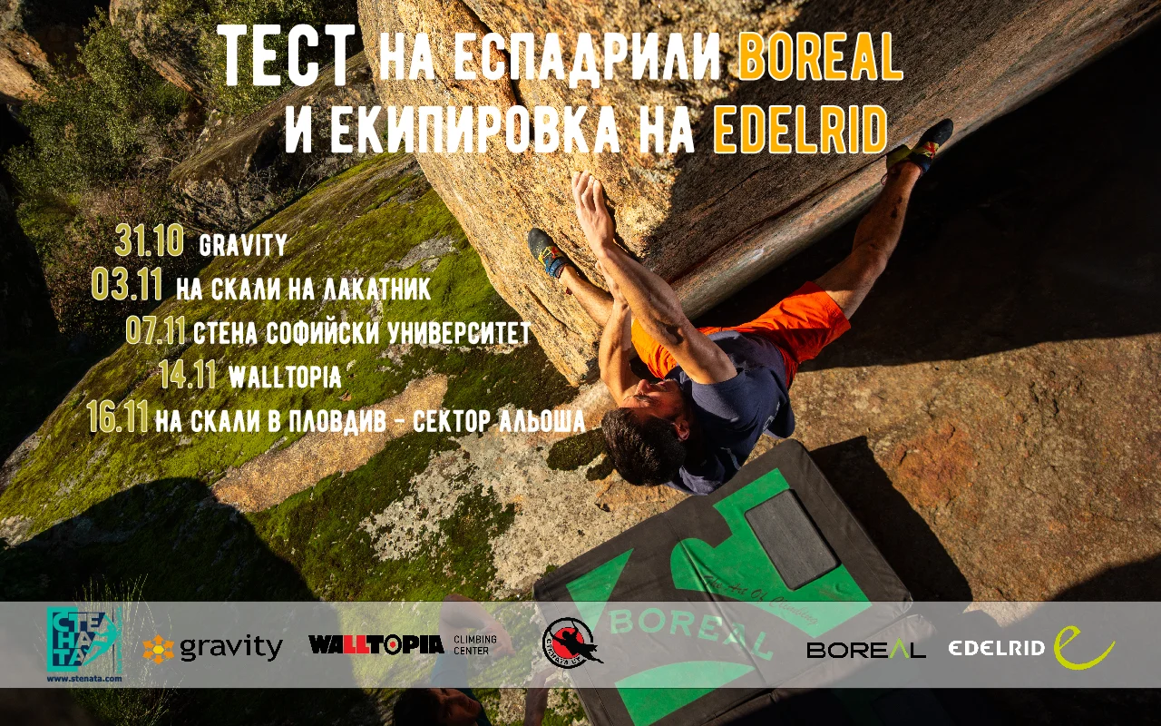 Магазини Стената ви дават възможност да изпробвате качествата на различни модели еспадрили Boreal, от „първи крак“, при това на място в три софийски зали за катерене и два обекта на скали.