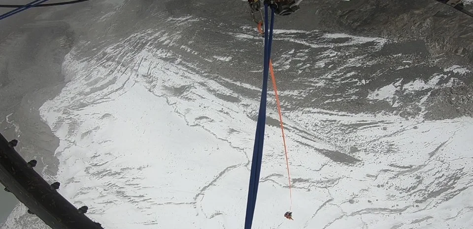 Никъде около позицията на Суела, обаче няма място за кацане с хеликоптер, а положението му е допълнително утежнено от силните ветрове. Налага се да бъде изтеглен с дълго въже, спуснато от летателната машина – трудна и опасна операция при възникналите климатични условия.
