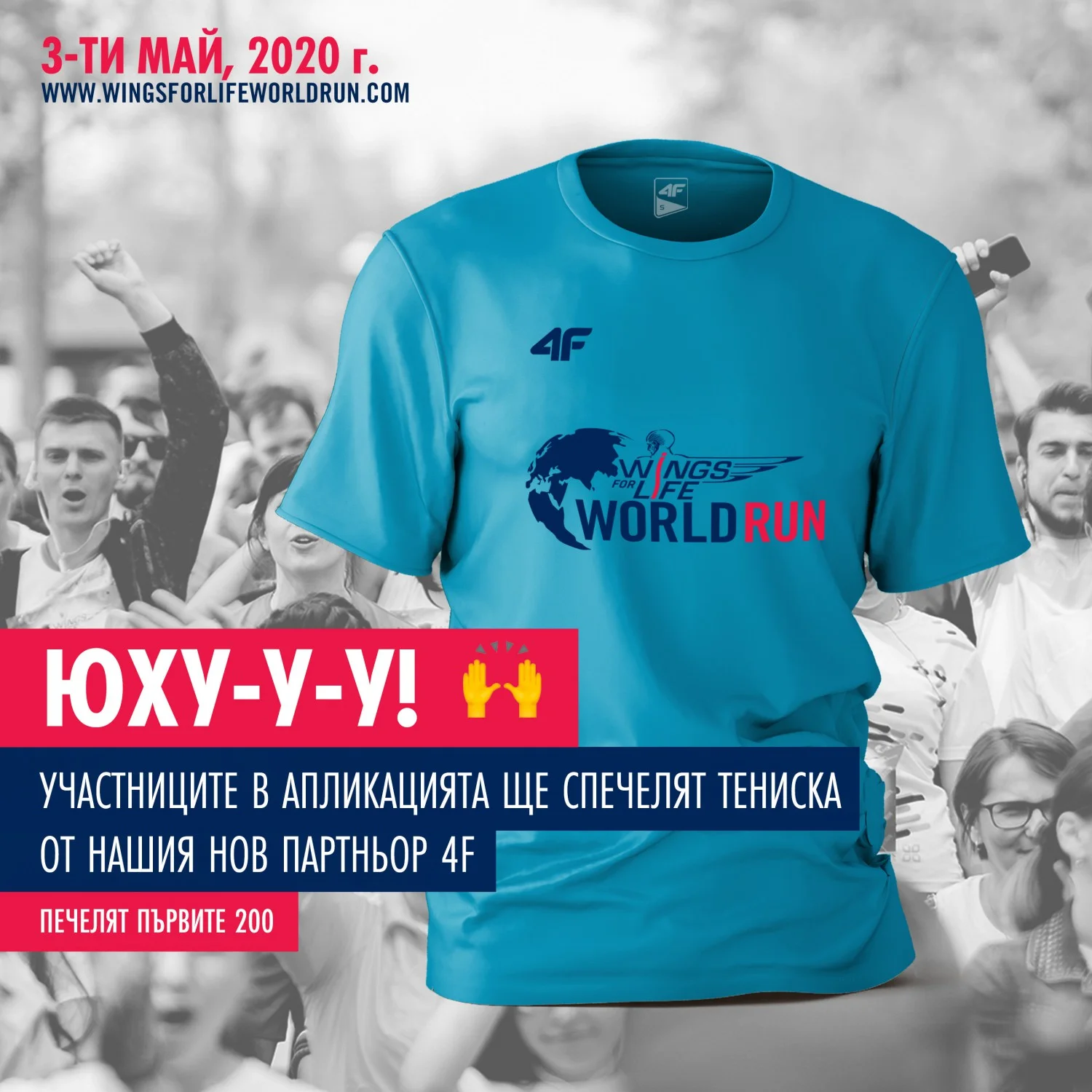 Първите 200 човека, регистрирали се в приложението на Wings For Life ще спечелят безплатна тениска от 4F!