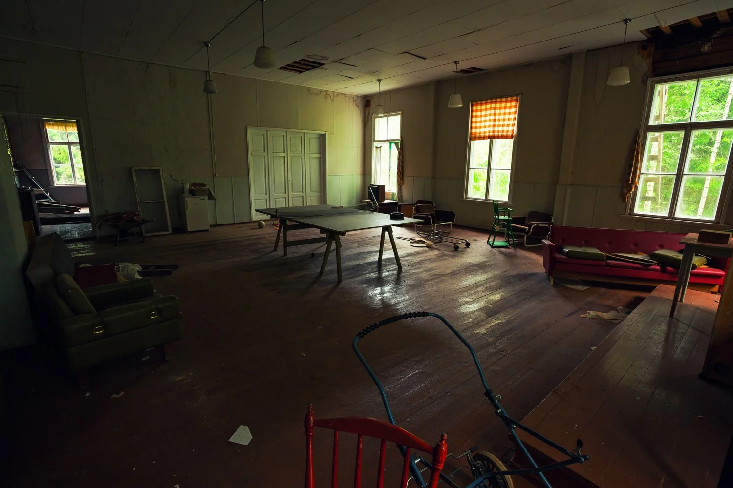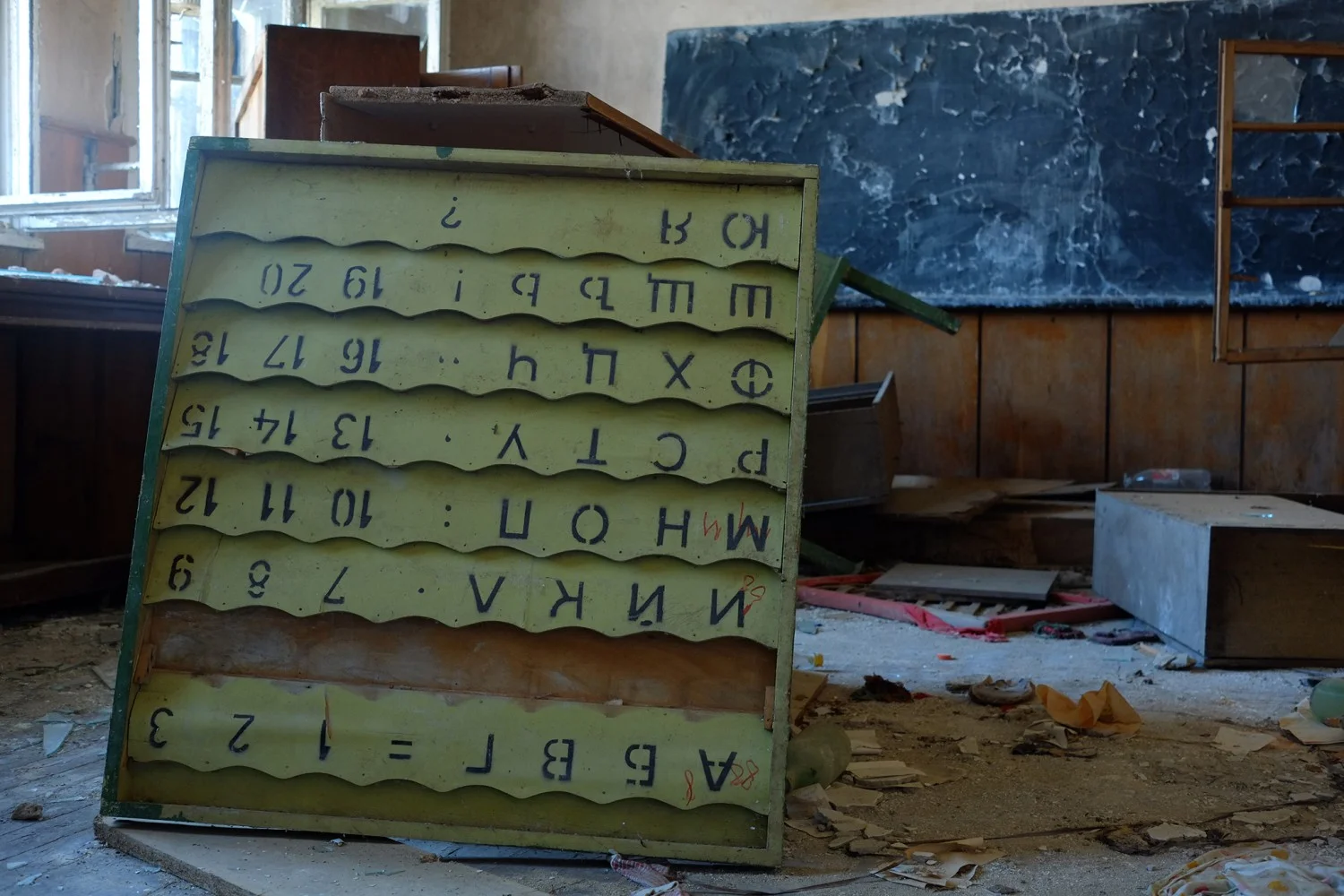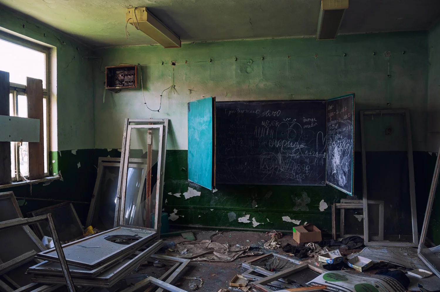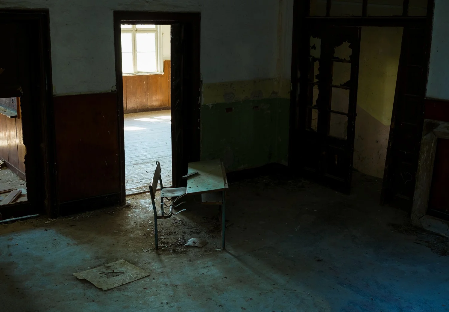 Навън е горещо и по улиците, както и в сградата на училището, няма никой. Лекият вятър свири през пролуките в зида и периодично потраква раздрънканите рамки на прозорците. Сякаш самите духове на един друг живот все още населяват сградата – несклонни, неискащи да забравят някогашната действителност.