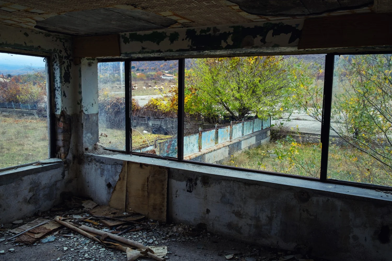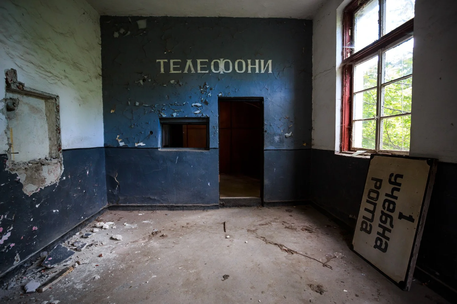 Артефакти от всякакъв тип красят четирите етажа на сградата. Чинове, буквари, лозунги и филмови ленти – захвърлени и забравени – сигнализират за пълната разруха на едно близко минало. Изкачва се по етажите, и когато стига до порутените, опасни стълби водещи до тавана, изкачва и тях. От долу до горе, и пак обратно, само руини и забвение.