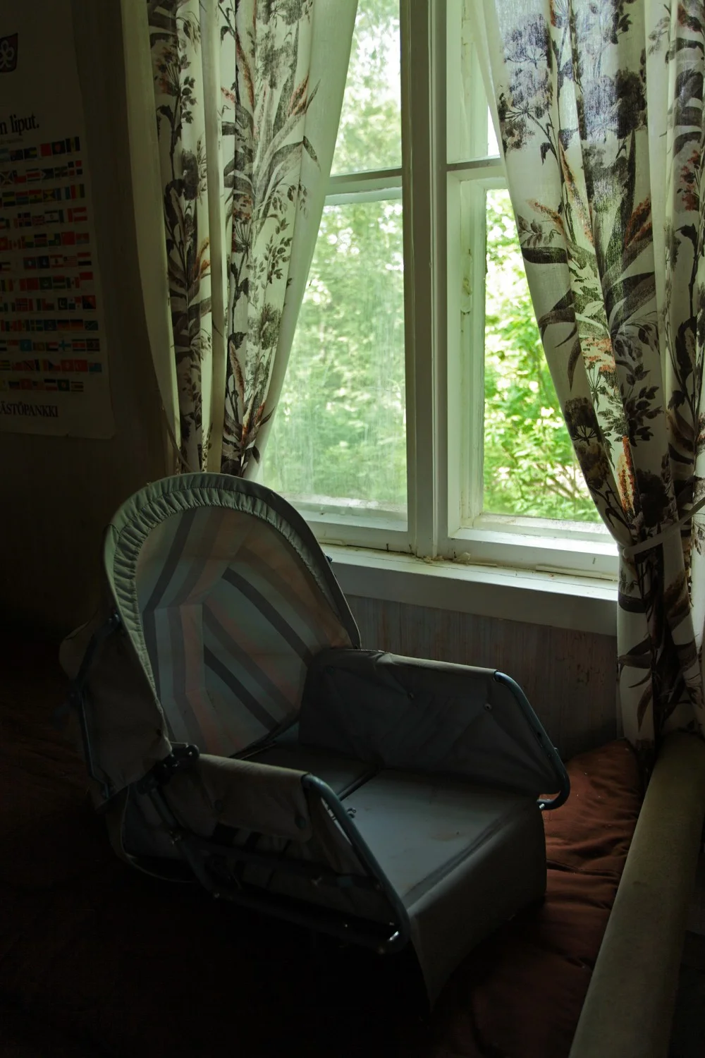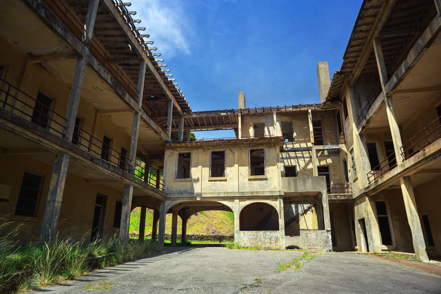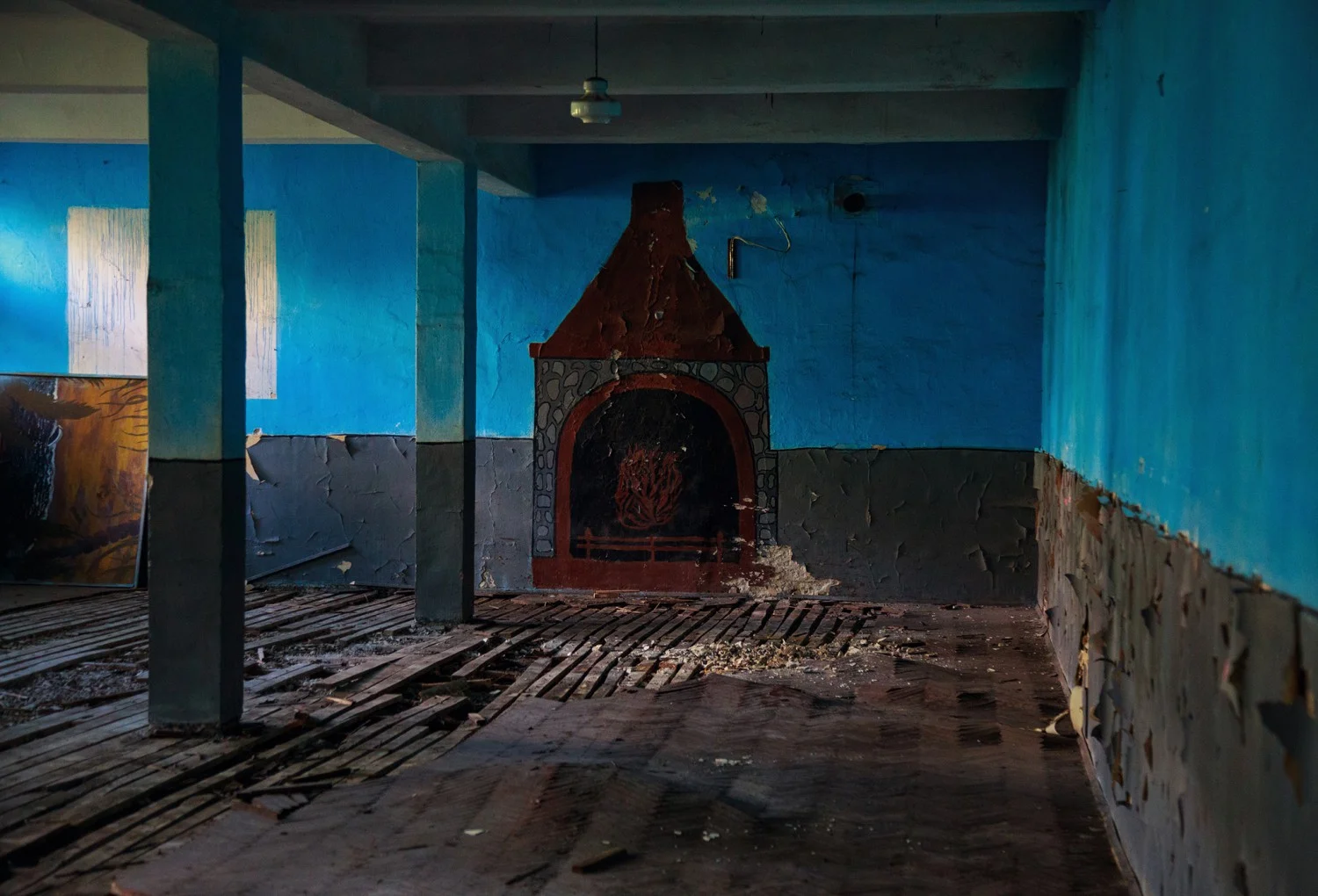 Понеже сградата вече дълги години не се ползва, когато отключва вратата се озовава в почти тотален мрак. Звуците на дъжда, проникващ през пролуките в бетона и писъците на птиците, единствените други обитатели, кънтят из масивния времеви саркофаг.