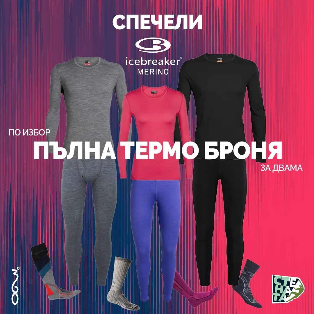 Наградният комплект включва: Термо бельо за двама от IceBreaker – 2 х горнище с дълги ръкави, 2 х долнище и 2 х чифта термо чорапи. Всичко това изработено от качествена мериносова вълна!