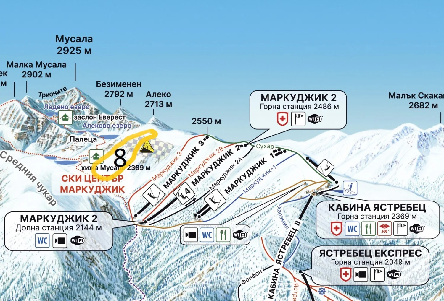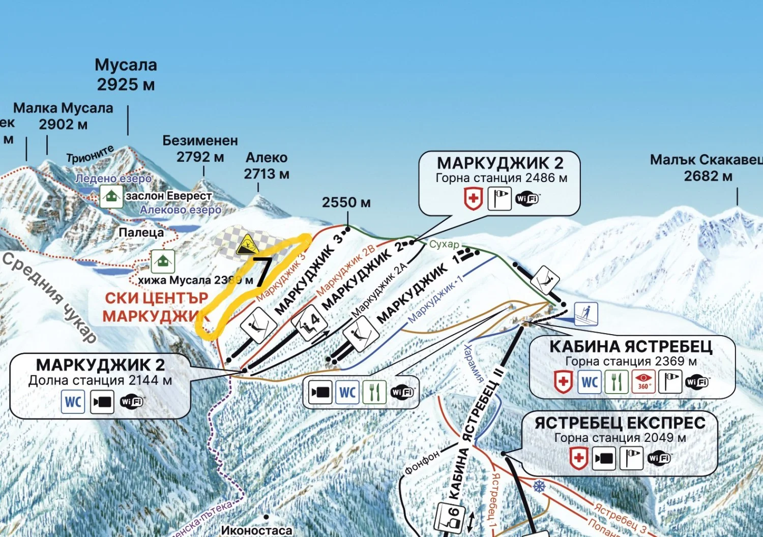 Най-лавинноопасните зони са обозначени, но не забравяйте, че карането извън пистата е на собствена отговорност и при взимането на решение да карате по такива терени разчитате предимно на себе си и на хората, с които карате.