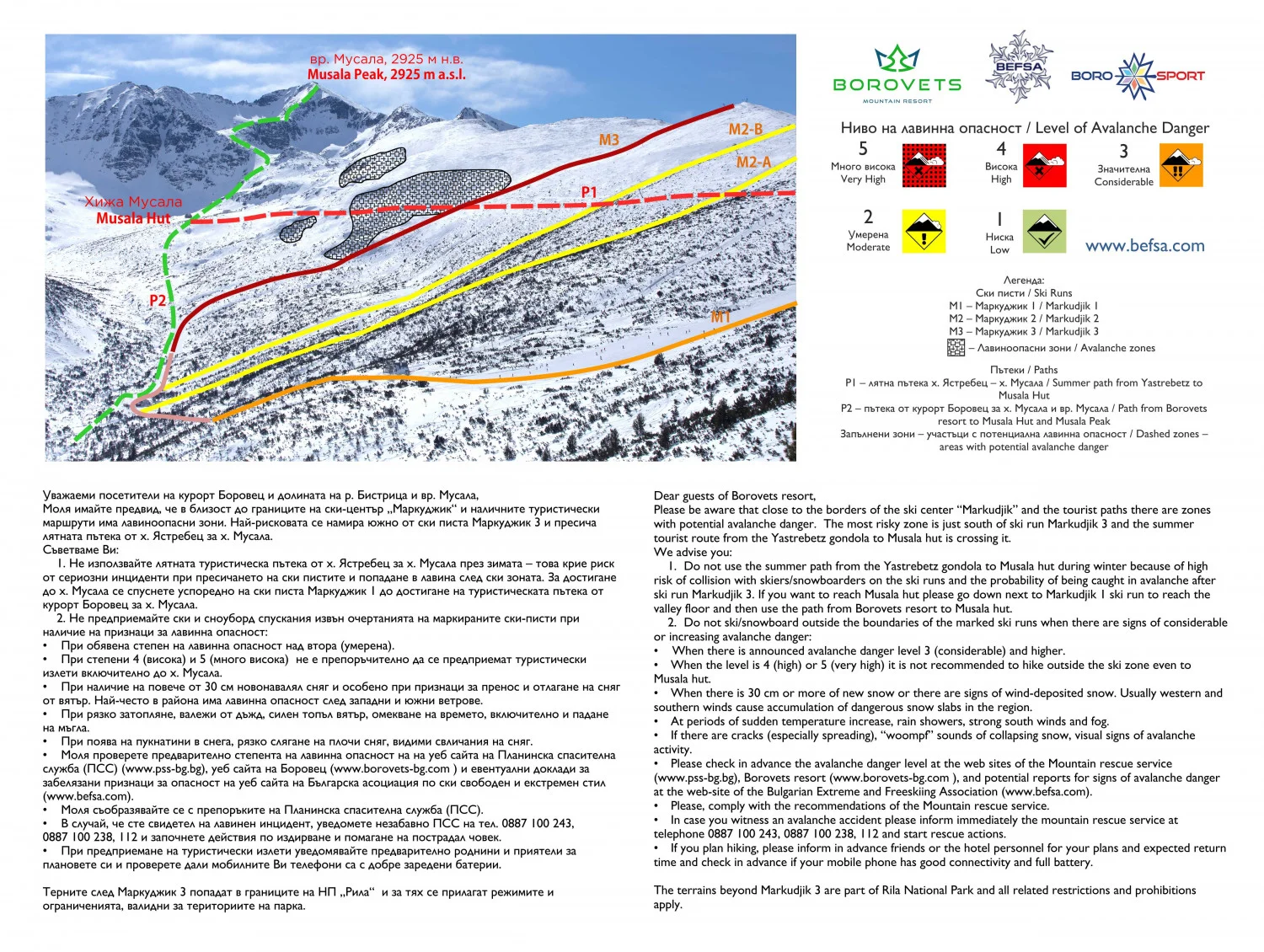 Съвместно с BEFSA, в Боровец е разработена карта, на която са показани лавинноопасните зони, най-важното, което трябва да се знае и степените на опасност. Тази информация я има, както на сайта на курорта, така и чрез физически табели във високата част на планината: Горна станция на кабинков лифт и лифт- Маркуджик 2.