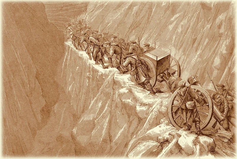 Най-сложно е пренасянето на оръдията, които дори и разглобени се носят много мъчно през снеговете. Конете няма как да ги теглят по тези пътеки и хората трябва на ръце да ги носят през поледица и в невероятен студ, а където е прекалено стръмно да ги спускат с въжета.