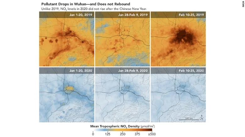 Сателитни снимки, пуснати от НАСА и Европейската Космическа Агенция (ЕSA)показват драматични спад на емисиите на азотен и въглероден диоксид във въздуха.
