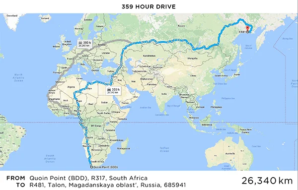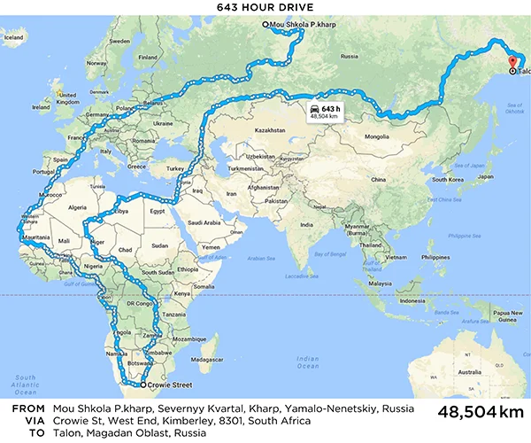 Един старт, три възможни посоки, крие последният пример за най-дългите маршрути на Google Maps. За този формат ви трябват свободни 643 часа, които да прекарате зад волана или по друг начин казано – изминете ги тези само 48 504 км. Пътят стартира от Ямало Нетецки в Русия, минава през Западния бряг на Южна Африка и приключва пак в Русия, в Талон, Магаданска област.