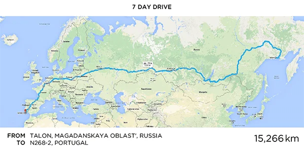 Питър Вандром пръв дава координатите на този маршрут в Google Maps. Маршрутът стартира от град Сагрес в Португалия до град Казан в Русия и е с обща дължина 15 266 км. Предвиденото време за преминаване с автомобил от точка А до точка Б е седем дни.