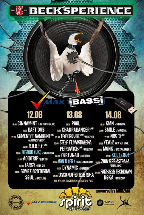Петък вечер MaxBASS ще посрещне една от легендите на atmospheric drum and bass – изпълнителят и собственик на лейбъла Soundtrax, известен като Big Bud /United Kingdom/. Съботата ще е посветена на дъбстепа с французинът Von D, известен с многобройните си шоута из цял свят, изнесени през 2010 и 2011, и топ издания за лейбъли като Boka и Argon между другото. Специалният гост в неделя ще бъде руснакът Kelt, който ще представи своята scratchie селекция. Водещ през всички вечери ще бъде добре познатият и много ценен заради предишни появи в събития на H.M.S.U. – MC Coppa.