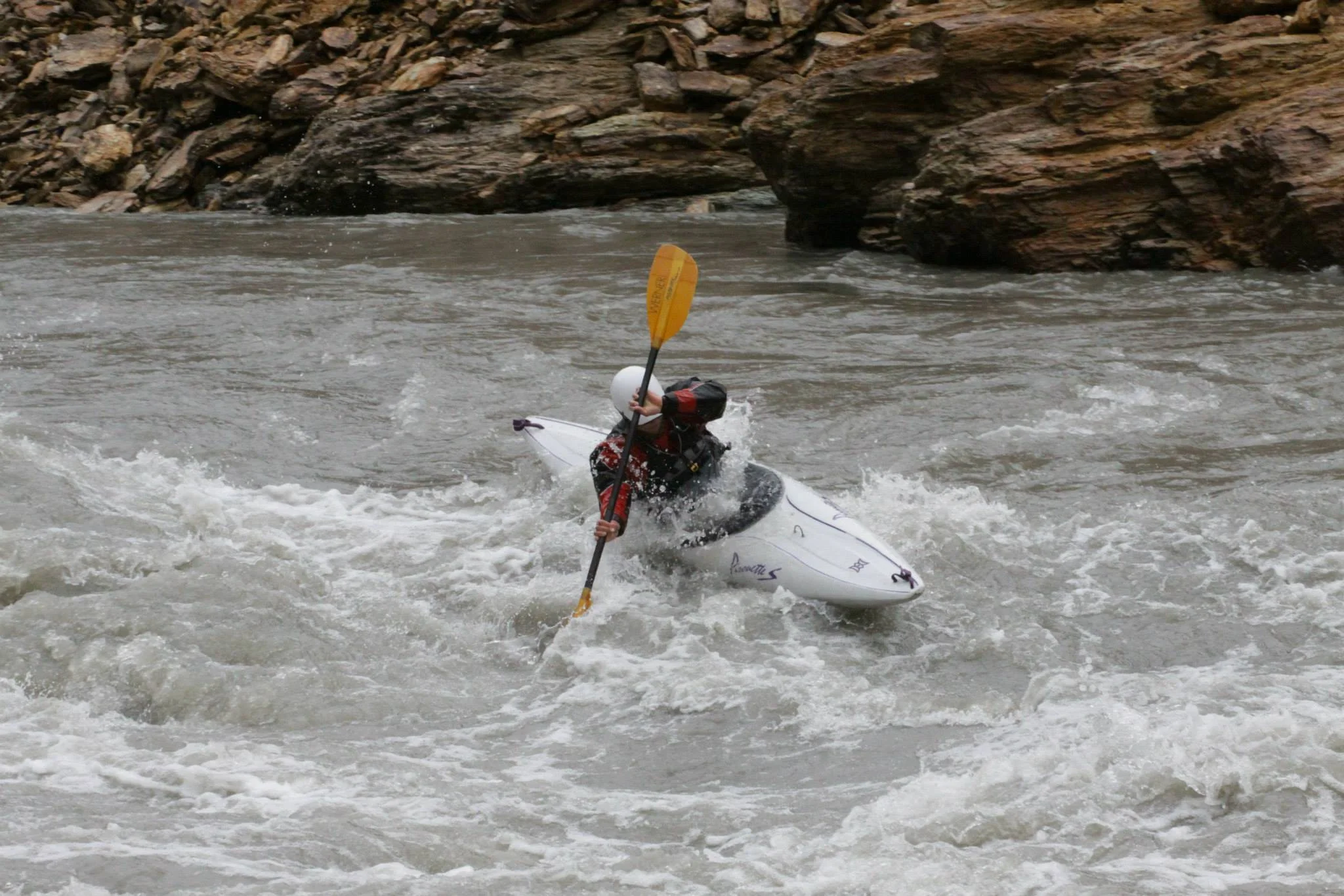 Движихме се, около един голям водопад след като преценихме, че няма чиста линия през него. Преди един голям бързей спряхме за оглед. Докато преценявахме откъде трябва да минем, лодката на Дилън се хлъзна в реката и греблото му се понесе по течението. Аз веднага скочих в каяка си и тръгнах надолу да го гоня. Без да оглеждам какво ме чака зад завоя. Гребах около 15 минути и така и не го намерих. Спрях да чакам греблото само да дойде при мен ако не съм го видял. Ако продължа надолу, разстоянието между мен и Дилън се увеличаваше. Гребях достатъчно дълго, че да настигна греблото и то нямаше как да е по-надолу от мен. След час чакане, греблото не се появи, но Дилън дойде плувайки. Беше оставил лодката и слязъл по-надолу да вземе греблото от мен и взел решение да продължи надолу очаквайки, че съм го намерил.