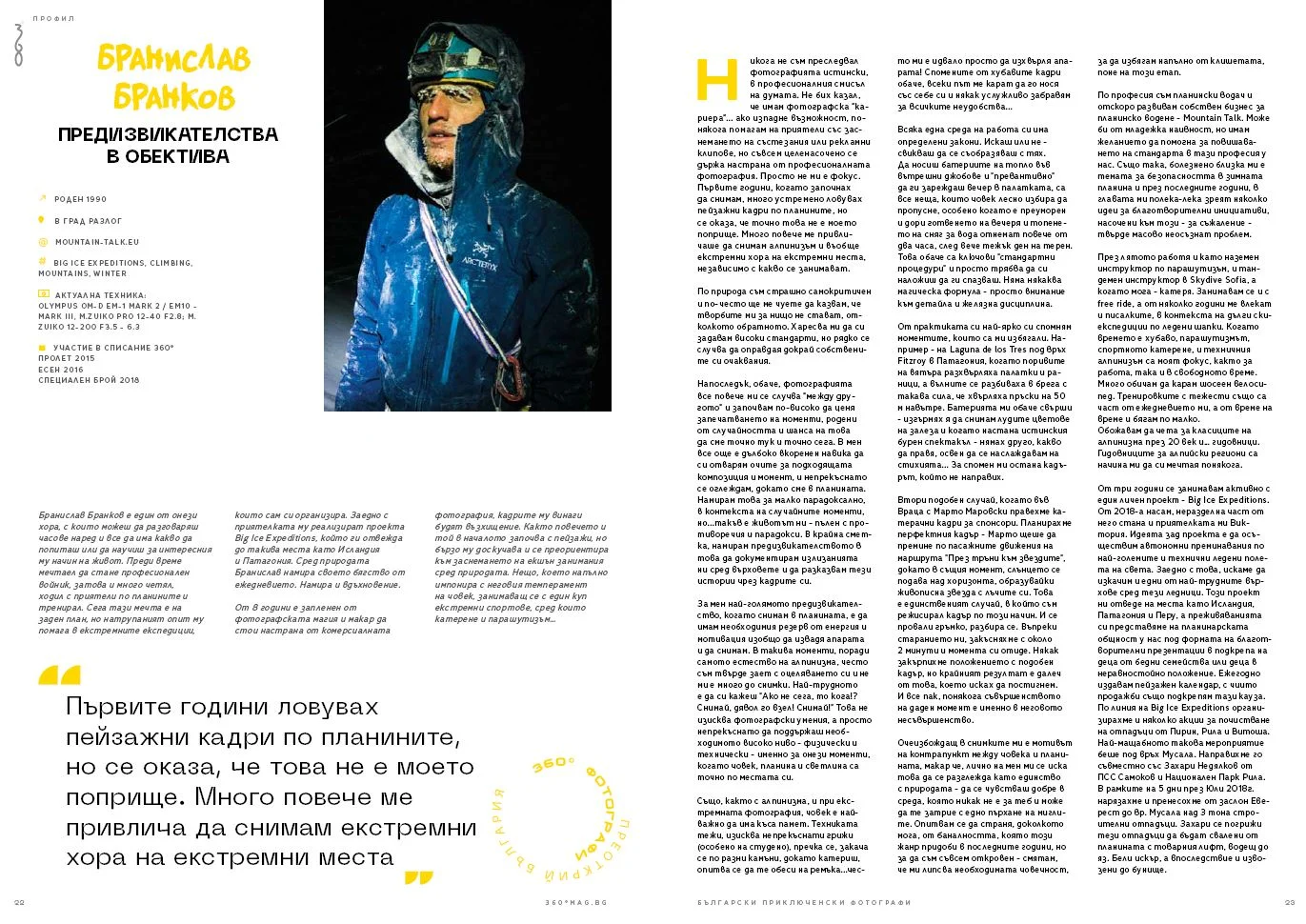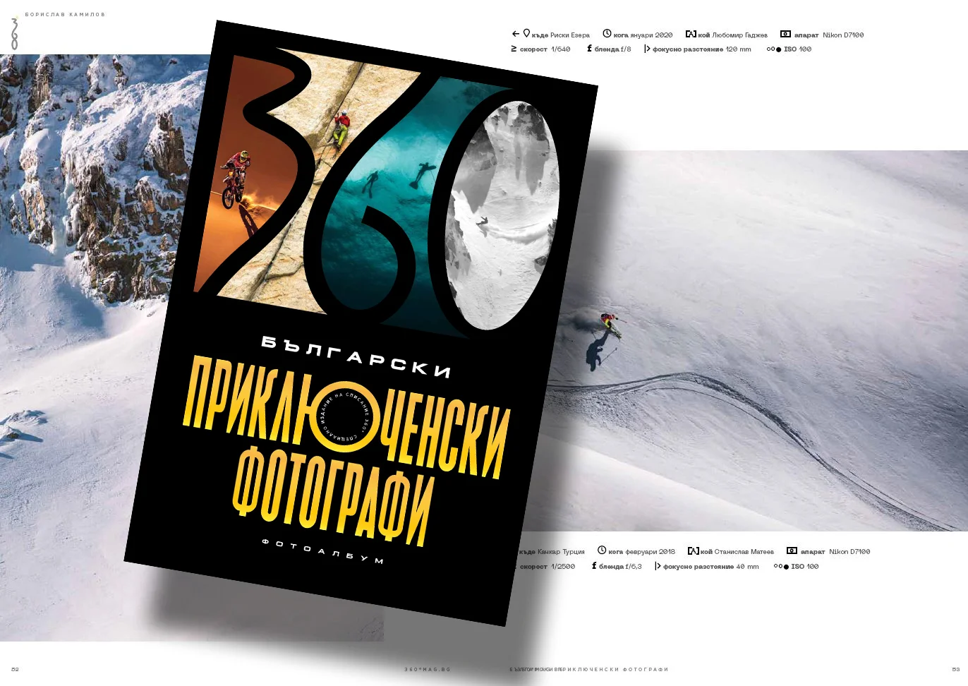 Започваме с фотоалбума „Български приключенски фотографи“*, в който сме селектирали 18 от най-добрите майстори на обектива, доказали се в аутдор средите. В това първо издание се фокусирахме върху онези от тях, които вече 12 години ни помагат да претворяваме нашите мечти във визуално и емоционално пътешествие из страниците на списание 360°. Тъй като поощряваме упоритостта и стремежа към израстване сме отделили няколко страници, за да ви представим и две млади надежди, чиито снимки ще виждате все по-често.