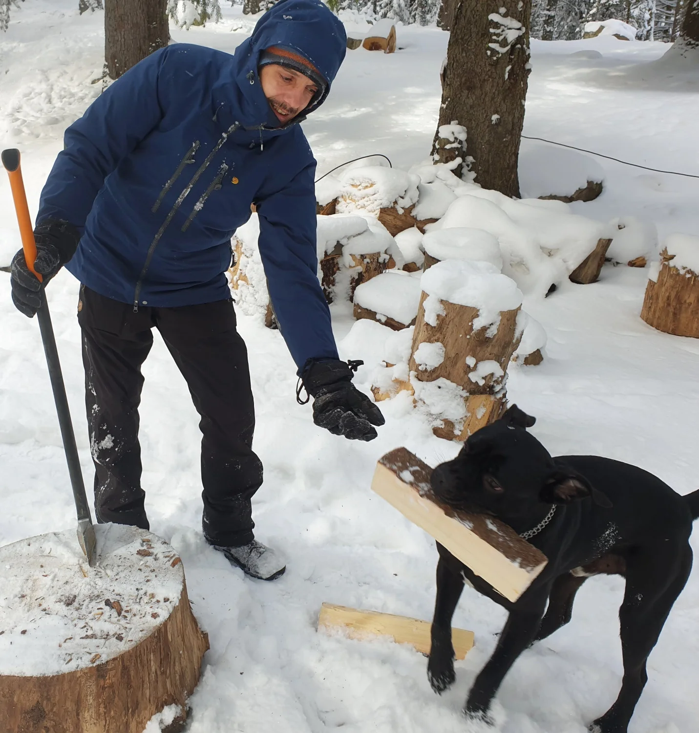 Цепене на дърва. Сериозна работа с повишено внимание, особено, ако кучето е наблизо. Баланса между държането на брадвата и хвърляне на пръчка надалеч, предполага здрава и гъвкава материя на облеклото, за да не шиете неприятни дупки след това.