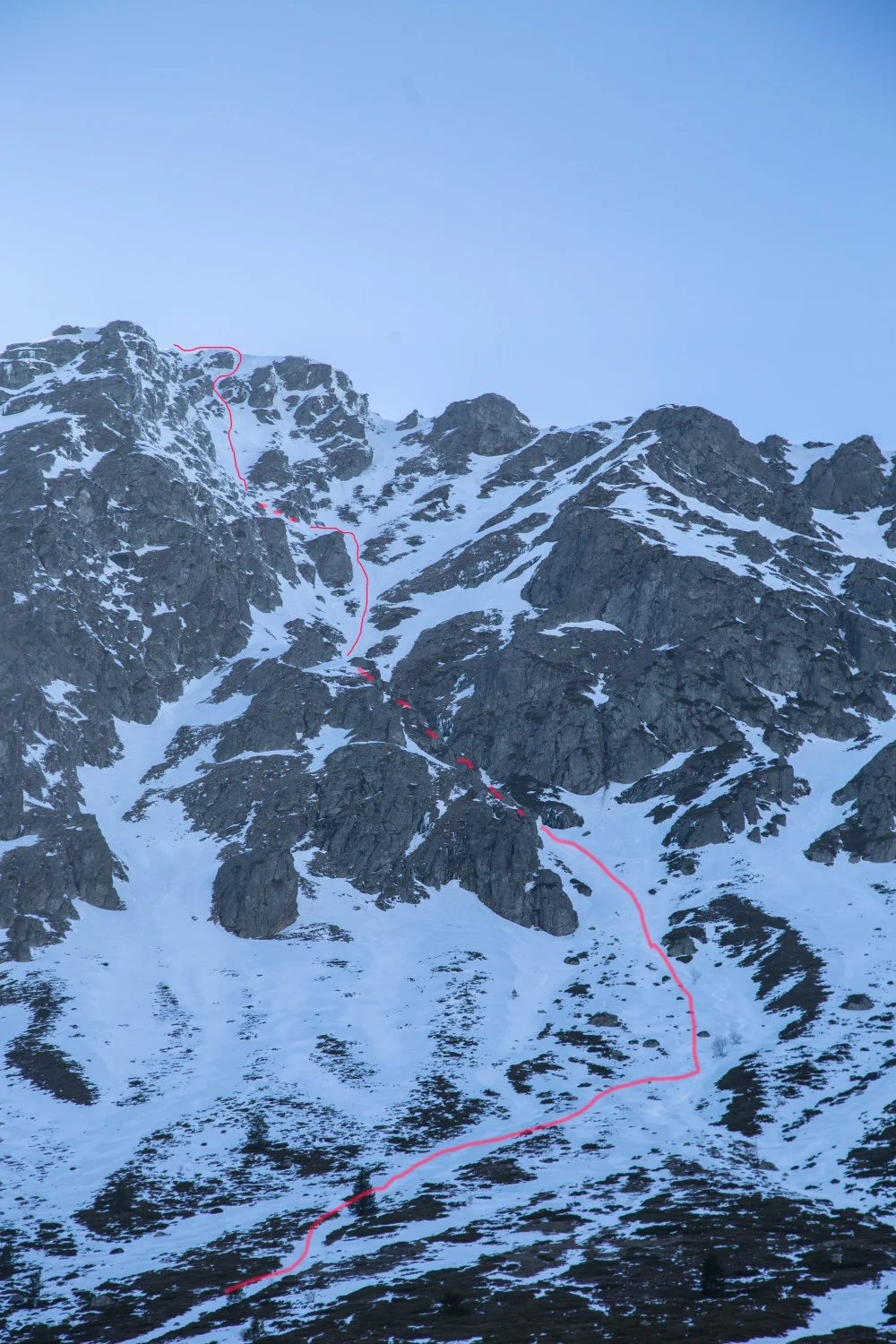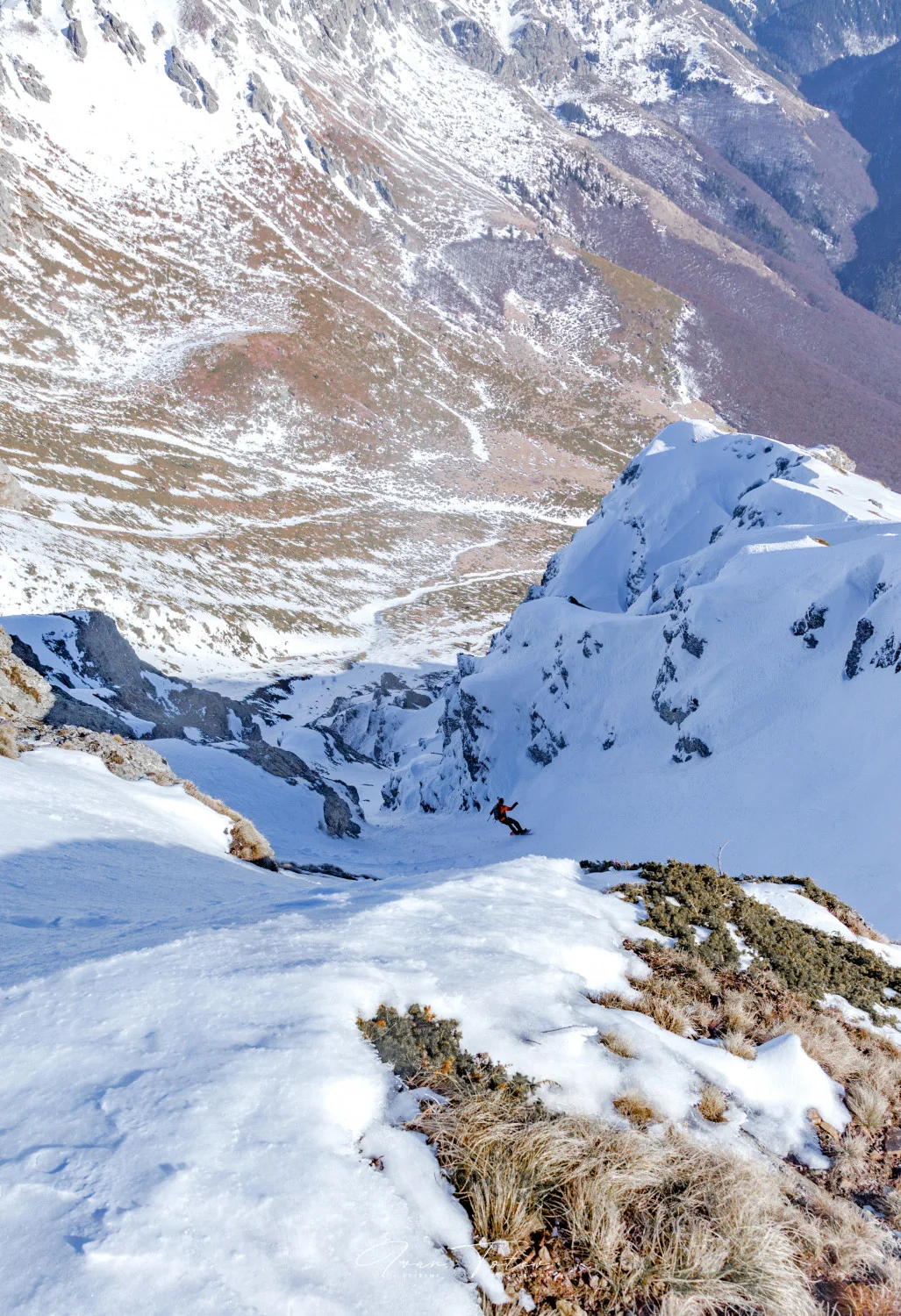 Ивайло: Теренът беше по-благоприятен, отколкото очаквах. Бяхме се подготвили за рапел(и), защото влизането от снимките изглеждаше твърде стръмно (>60 °). За мое учудване нямаше нужда от рапел нито на влизане в склона, нито по време на карането. Стартът беше с наклон от около 40 градуса. Въпреки слънчевия ден, снегът не беше отпуснал и беше много твърд, особено в средната част на улея. Предизвикателно е да караш по експониран терен с подобен наклон и толкова твърд сняг, защото едно подхлъзване може да има твърде неприятни последствия. Ако паднеш на такъв терен, единственият сигурен начин да се спреш е да приложиш техника на самозадържане. Наклонът в улея на места достига 45°, има и доста тесни участъци. В по-добри снежни условия карането по този склон би било изключително приятно занимание. Друг е въпросът, че да хванеш добър и стабилен сняг на южен склон в Балкана е малко вероятно.