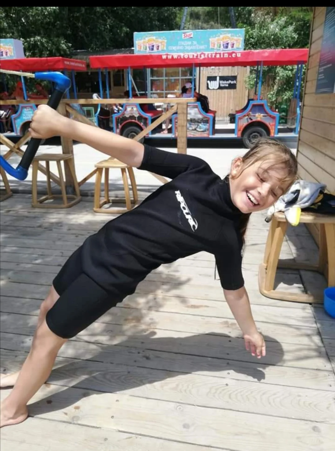 Радост поддържа форма като ходи на тренировки по плуване, катерене, скейтборд, ролери и уейкборд.