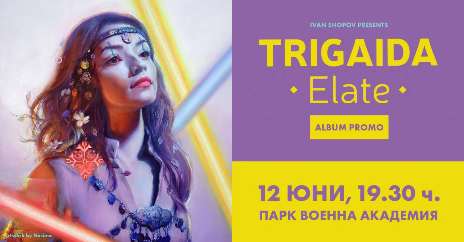 С мащабен концерт на 12 юни от 19:30 ч фолктроника триото TRIGAIDA ще представи на живо дебютния си албум ELATE в бутиковия, обгърнат от зеленина и уют Парк Военна Академия. Продукцията на музикантите, чиито имена не се нуждаят от представяне – Иван Шопов (Cooh), Георги Маринов-Хорхе и Ася Пинчева (Оратница), вече се радва на фантастичен успех не само у нас, но и зад Океана, миксиран в съвременен, електронен вариант и високо оценен от всички родни и чуждестранни почитатели на магическия български фолклор.