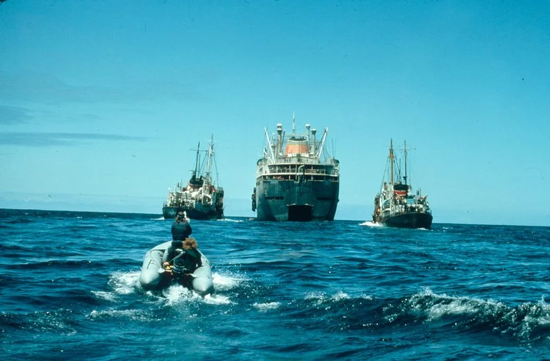 Лодката на „Грийнпийс“ се приближава към руската китоловна флотилия „Данилов Восток“ и лодките с харпуни. Северен Тихи океан. © Greenpeace / Rex Weyler