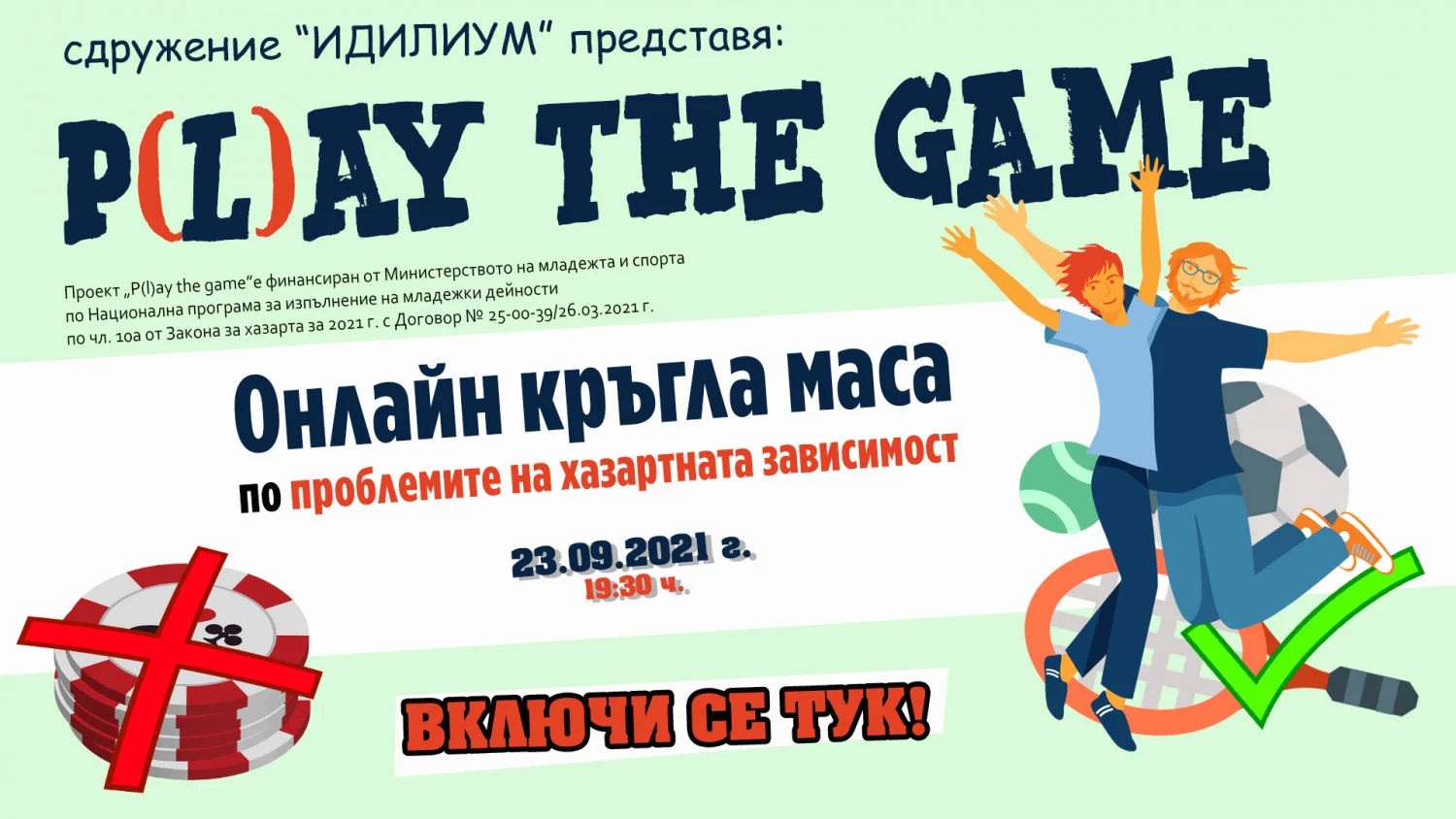 На 23 септември от 19:30 часа, Сдружение “Идилиум” организира онлайн кръгла маса по проблемите на хазартната зависимост “P(l)ay the game”.