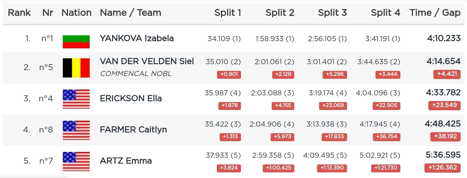 Във вчерашния, 7-и старт Изабела Янкова отново завърши състезанието с впечатляваща преднина от над 4 секунди пред втората в класирането – Сиер Ван Дер Велден, от Белгия и повече от 23 секунди пред третата в класирането – Елла Ериксон, от САЩ.