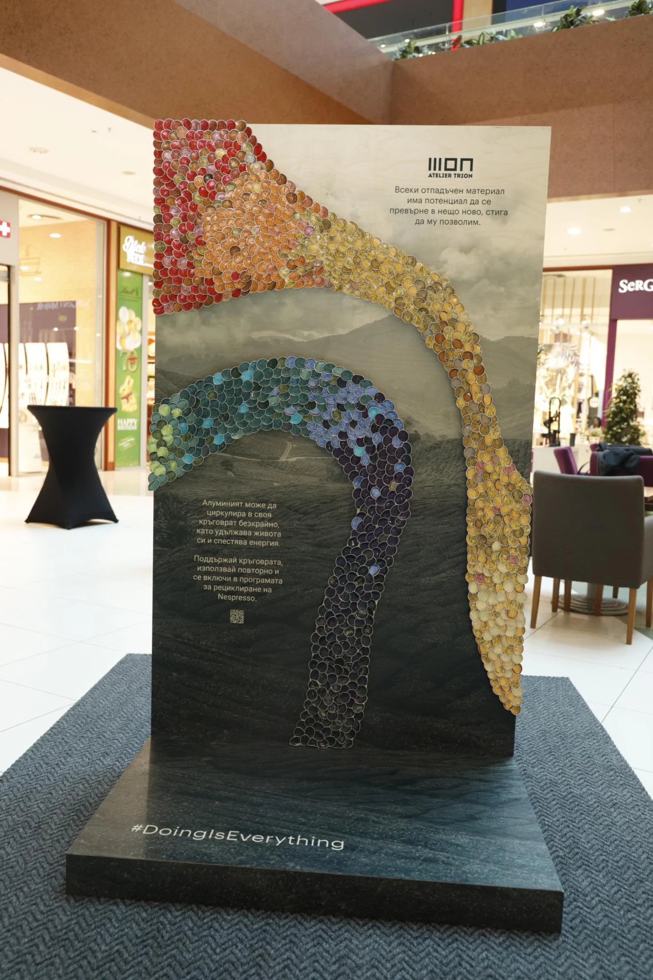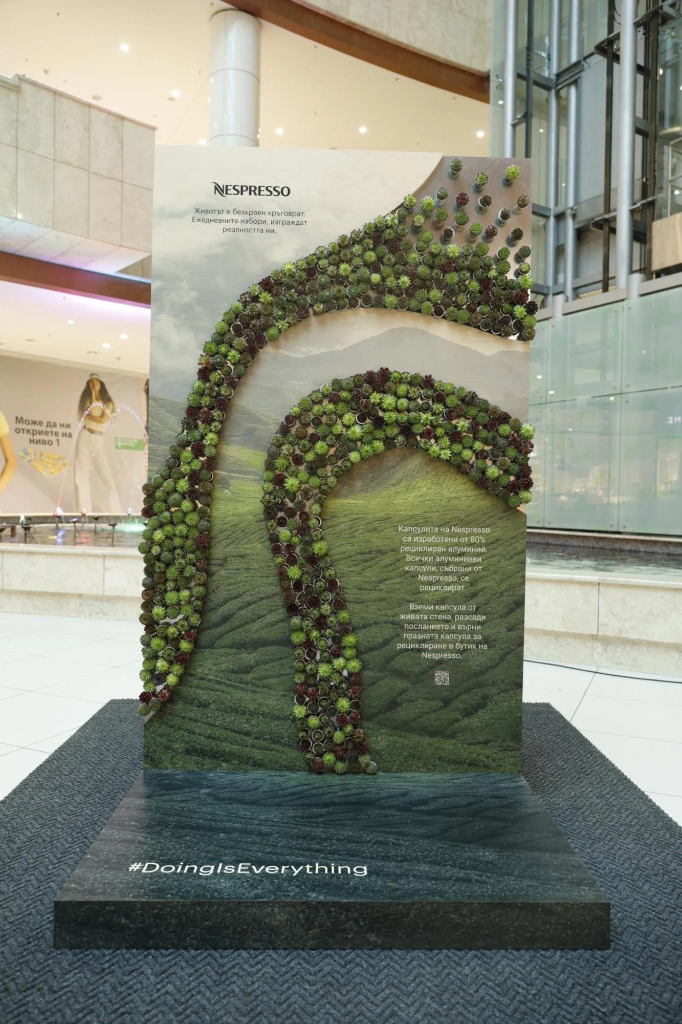 Арт инсталацията #DoingIsEverything ясно подчертава разбиранията на бранда, с умело подбрани изразни средства. Тя представлява двулицево пано с размери височина 200 см и широчина 150 см, като за направата му са използвани над 2500 капсули Nespresso. Всяка една от страните на паното е призвана да насочи вниманието към различен аспект от ангажимента към устойчивост на швейцарския кафе производител.