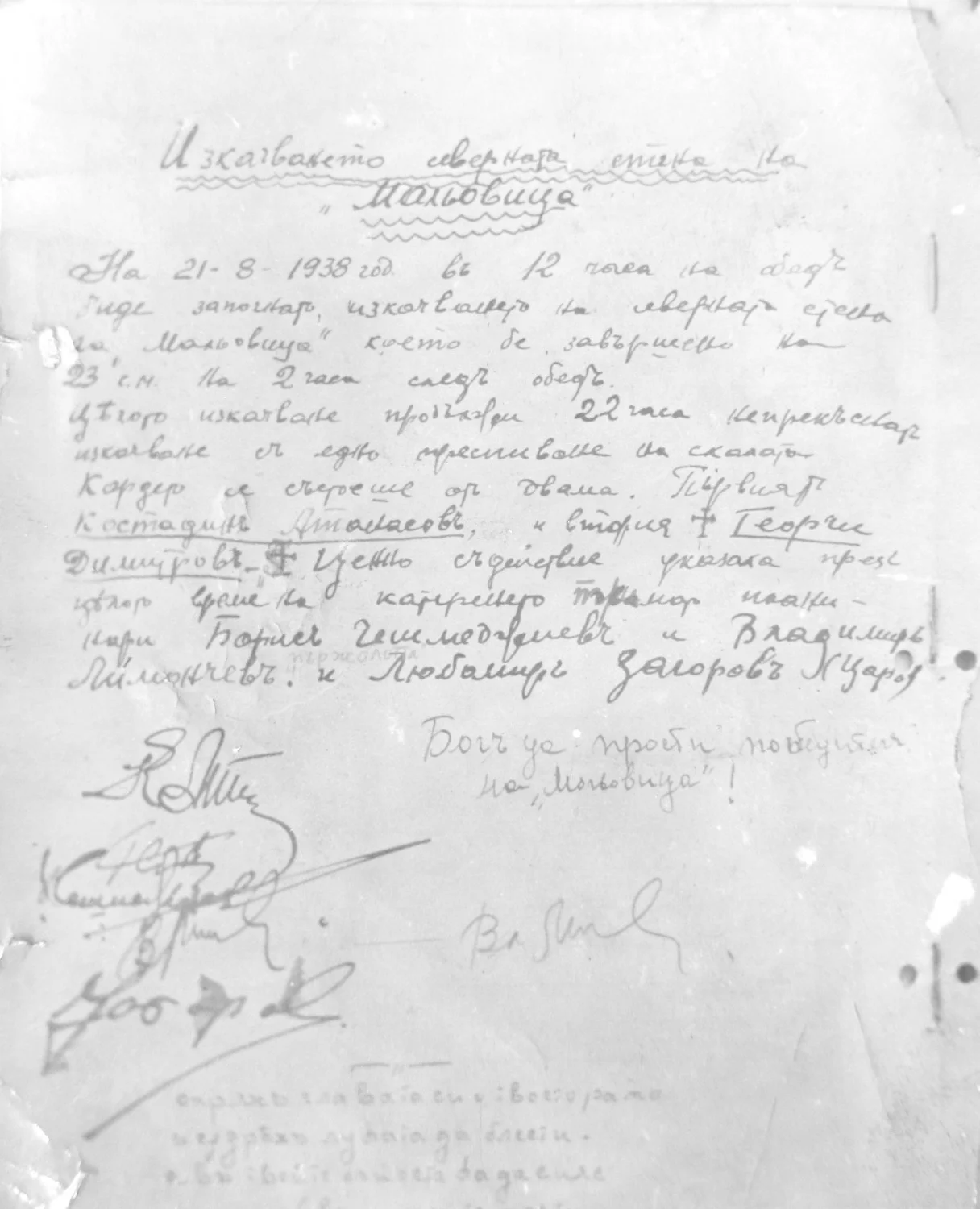 Ето го и него. Той е написан и подписан още същия ден 23 август 1938 г. след излизането от стенаната от двамата алпинисти, осъществили изкачването Константин Атанасов /Саваджиев/и Георги Димитров Стоименов/, както и от тримата им придружители, изпълняващи ролята на спасители Борис Чешмеджиев, Владимир Лимончев и Любомир Загоров. Виж факсимилие от оригиналния документ, който поради трудността на разчитането му прилагам точен прочит.