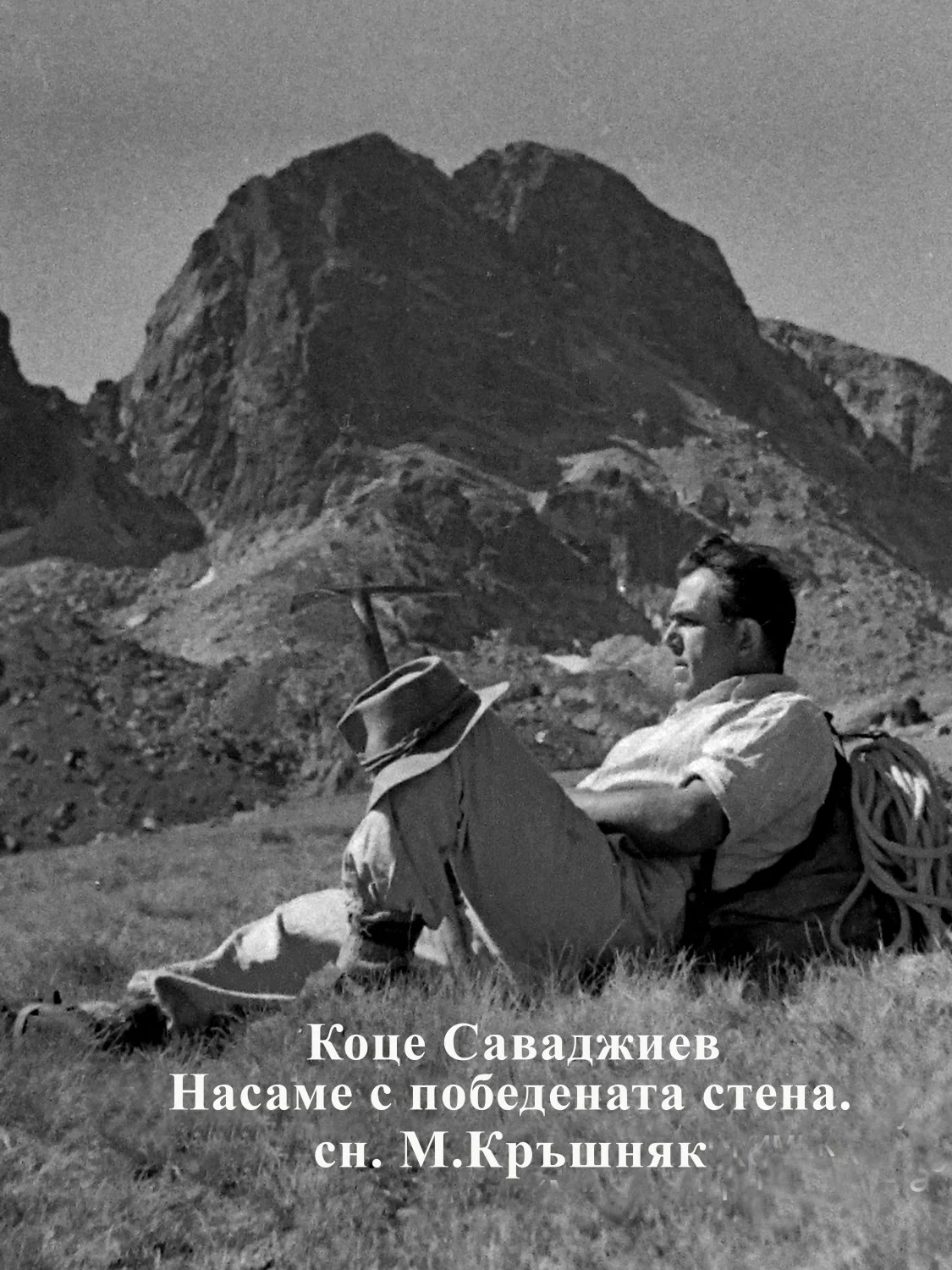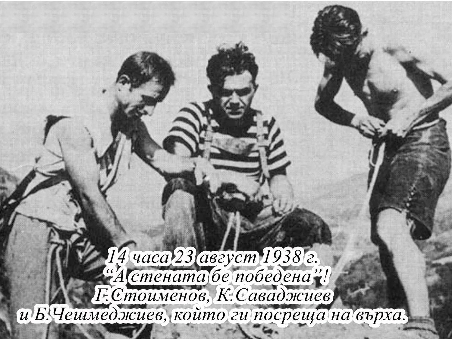 „На 20 август 1938 г. заедно с Георги Стоименов и двамата ни придружители Борис Чешмеджиев и Владимир Загорчев потегляме за Мальовица, за да опитаме силите си с непрестъпния връх. Под тежестта на 25-30 килограмовите раници на 21 с.м. в 9 часа сутринта пристигаме в подножието на върха, гдето се установихме на бивак. Над третото малко езеро, 15 минути от обекта за катерене биде опъната палатката ни. Точно в 11.30 часа преди пладне, неделя, с благопожелания за успех навлязохме в скалата.