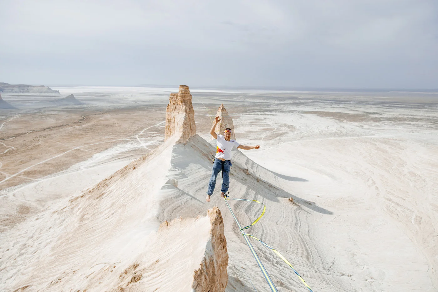 Ян Розе опъва своя слаклайн между двете скали, наричани „зъбите“. С годините повечето скали в региона са разрушени от външни климатични фактори и са останали само тези две, на мястото, маркиращо входа на провинция Мангистау.