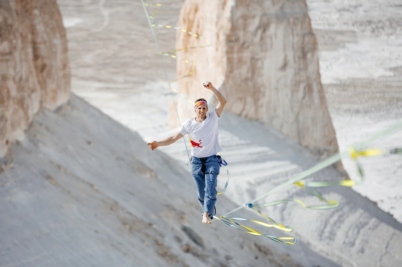 Веднъж като опънеш лентата за слаклайн (в случая хайлайн), ти трябват само търпение, методика, баланс и фокус. Да се придвижваш стъпка по стъпка половин километър, на височина 200 метра над пустинната повърхност, не е лесно. Но място като това определено си струва.