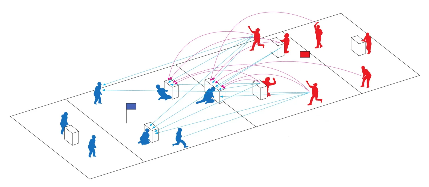 Играят се три сета по 3 минути. За победа се счита пленяването на знамето на отбора или елиминирането на всички играчи. Ако в редовното време не се стигне до това, то печели отборът, уцелил повече противници. Зачитат се само директните удари с топка, а каските са абсолютно задължителни.