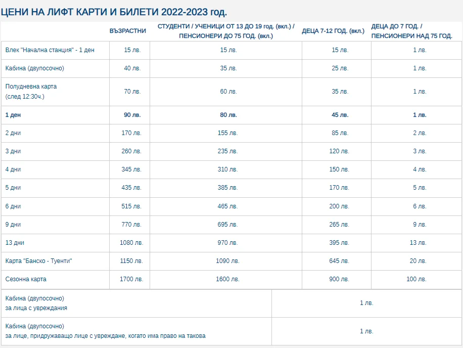 Ски сезонът в Банско бе открит на 17 декември 2022 г., въпреки нищожното количество сняг. На 15 януари, по случай Световния ден на снега, в Банско децата ще карат само срещу 1 лев. С 14% по-скъпо ще плащаме за лифт картите там през този зимен сезон. Най-купуваната и тази година е дневната, чиято цена от 79 лева вече е 90 лева.