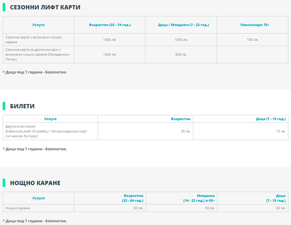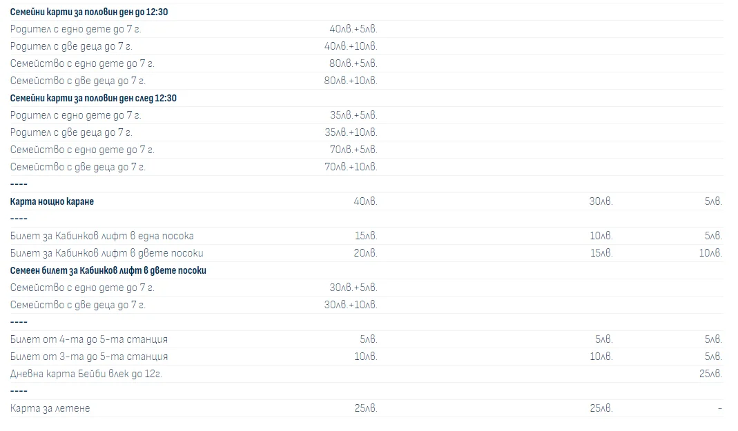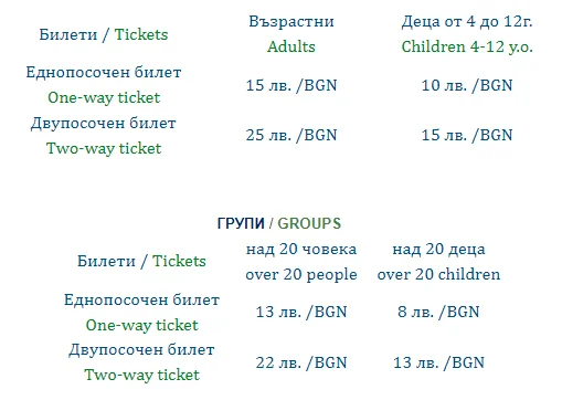 Цени еднократен билет за лифта: възрастен – 15 лв., студенти – 13 лв., деца от 7-12 г. – 10 лв, деца до 6 г. – безплатно.