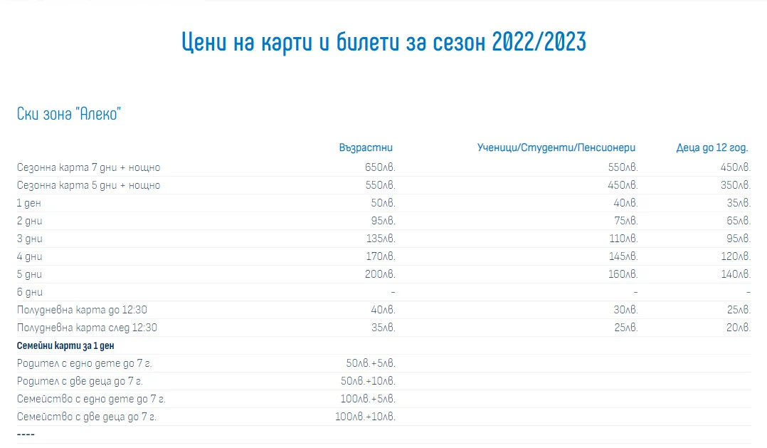 Боровец, цени за сезон 2022/2023 (1)