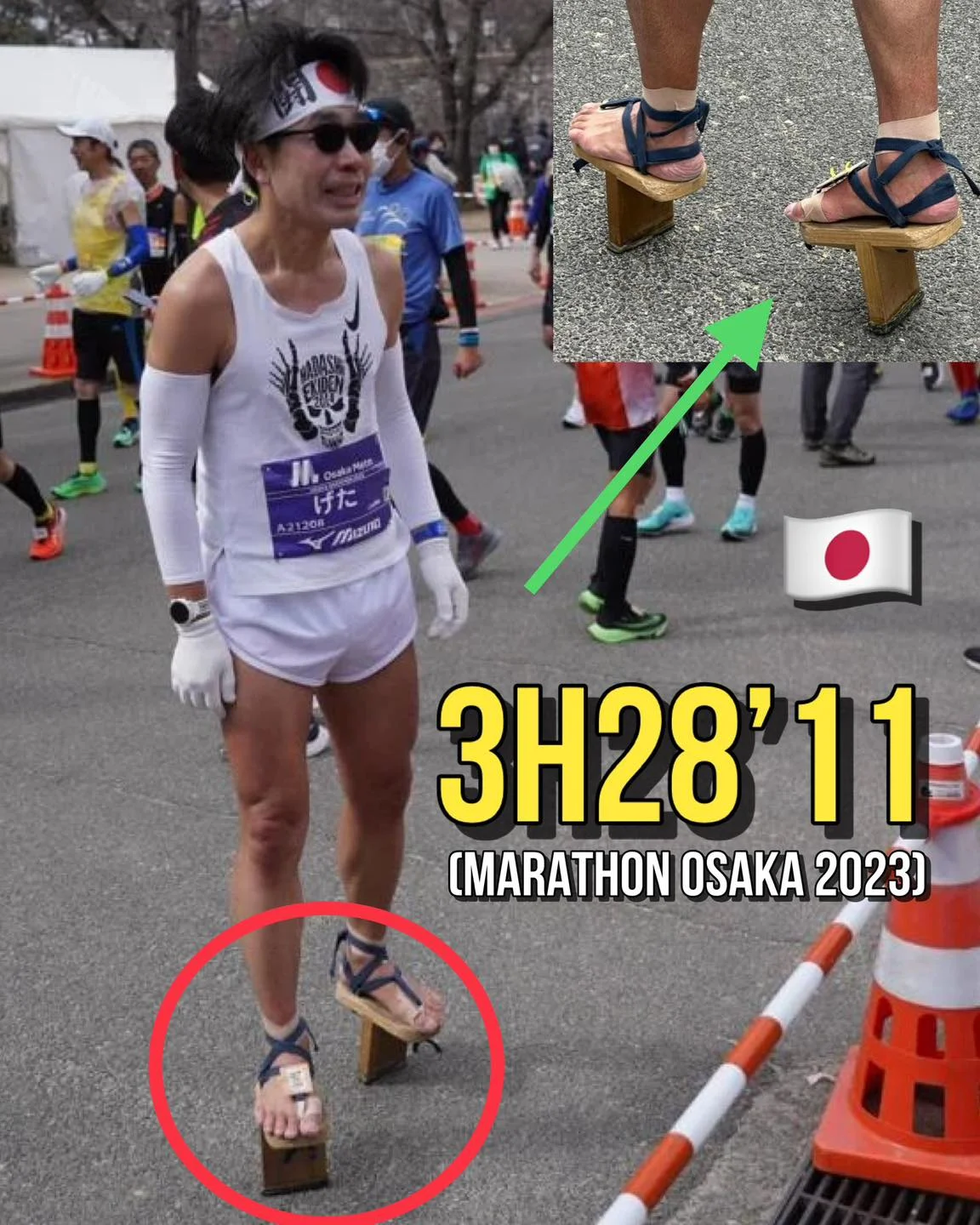 На 26 февруари 2023 г., на маратона в Осака, Таканобу Миношима финишира класическата 42,195 км дистанция за 3:28:11 часа със средно темпо 4:56 минути на километър. Това е негово лично постижение в бягането с „еднозъби гети“. А колко ли би бягал с маратонки?