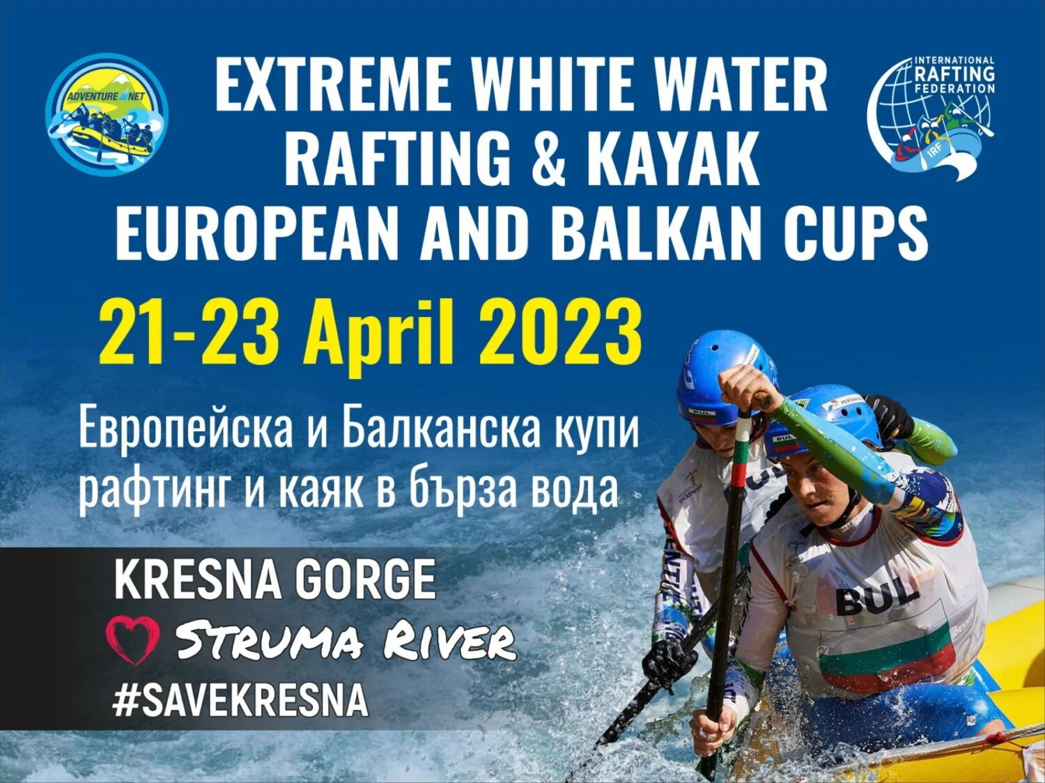 На 21-23 април 2023 г. в река Струма (клас 3), Кресненското дефиле, под организацията на Спортен клуб “Приключенска мрежа” и с подкрепата на Българска федерация по рафтинг ще се проведе състезание по рафтинг от сериите Европейска купа към Международната рафтинг федерация (IRF).