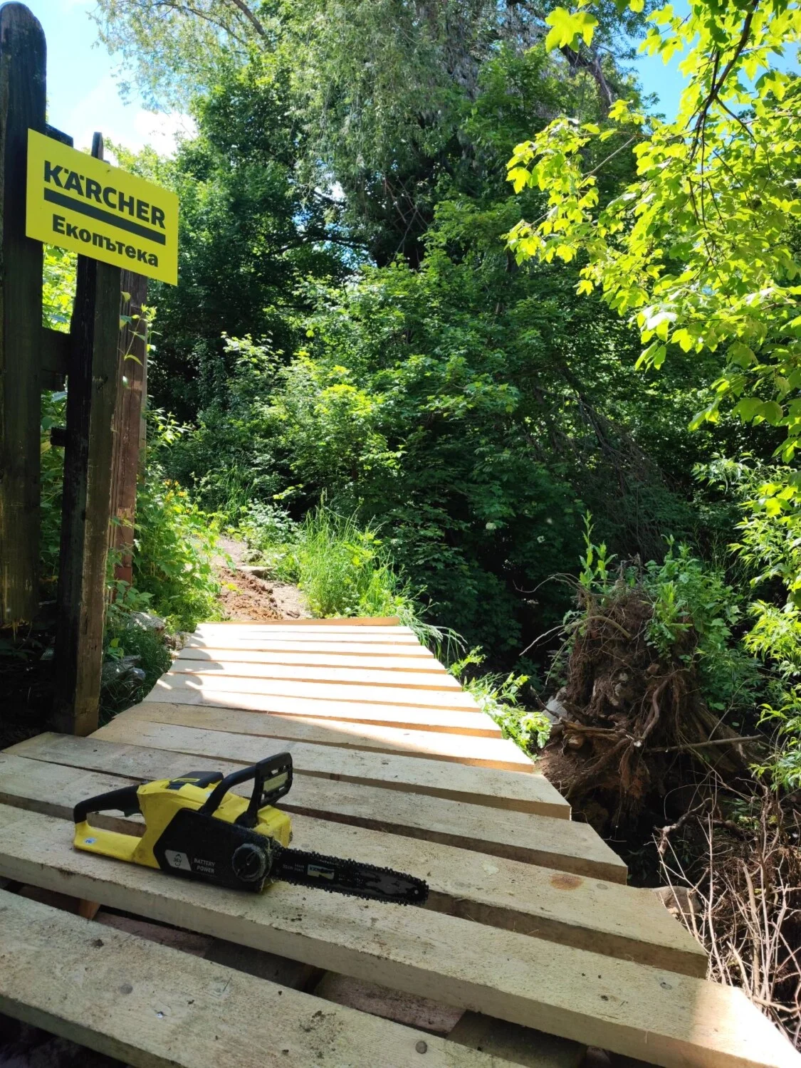 Благодарение на акумулаторните градински уреди тример, храсторез и резачка на клони на Керхер екипът успя да обособи пешеходния маршрут, който тръгва вдясно от Симеоновския лифт и окосиха терена с четириколесна косачка. Журналистите подготвиха и новите дървени греди с акумулаторни верижни триони, за да бъде възстановено и мостчето по екопътеката.